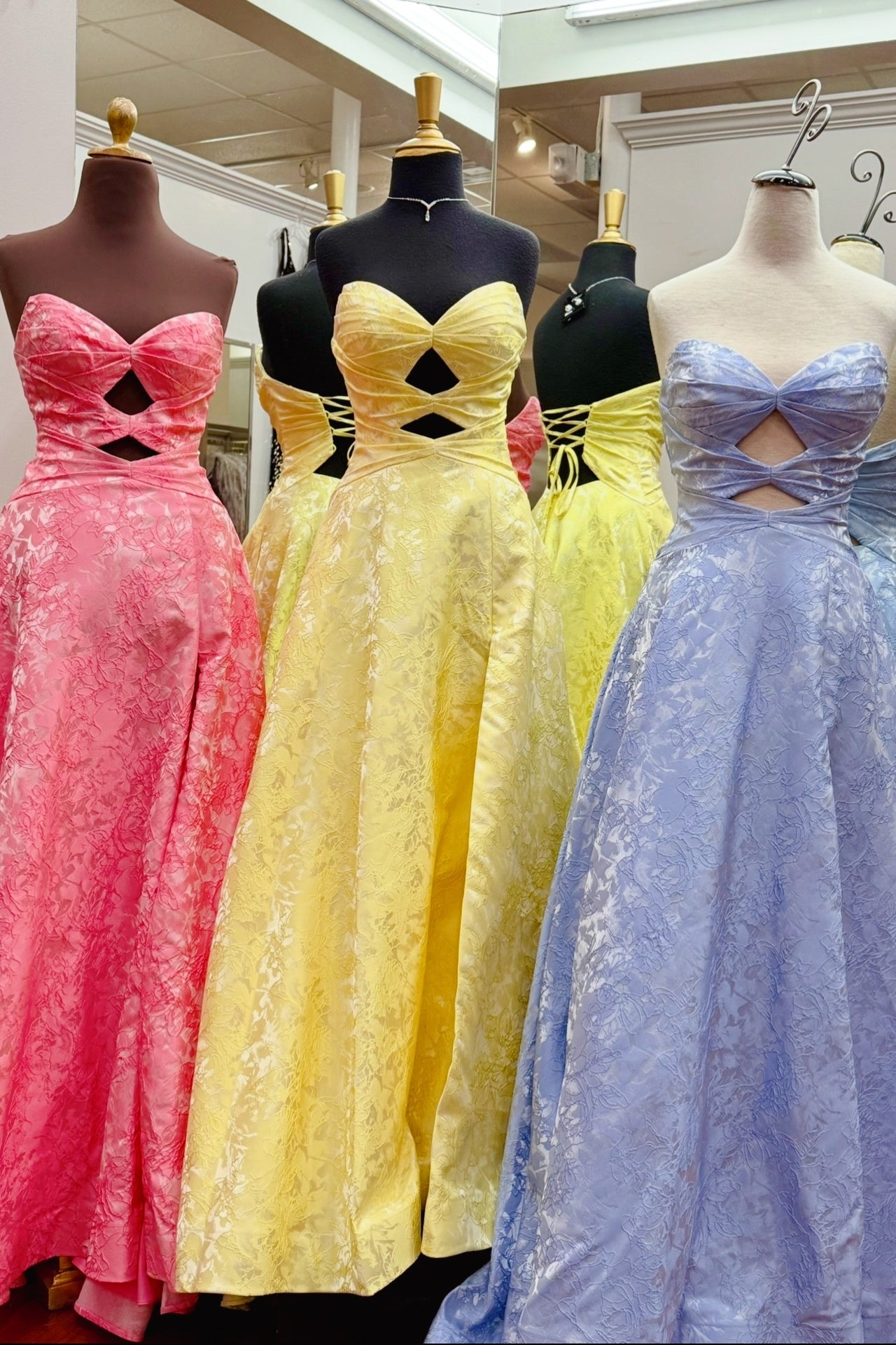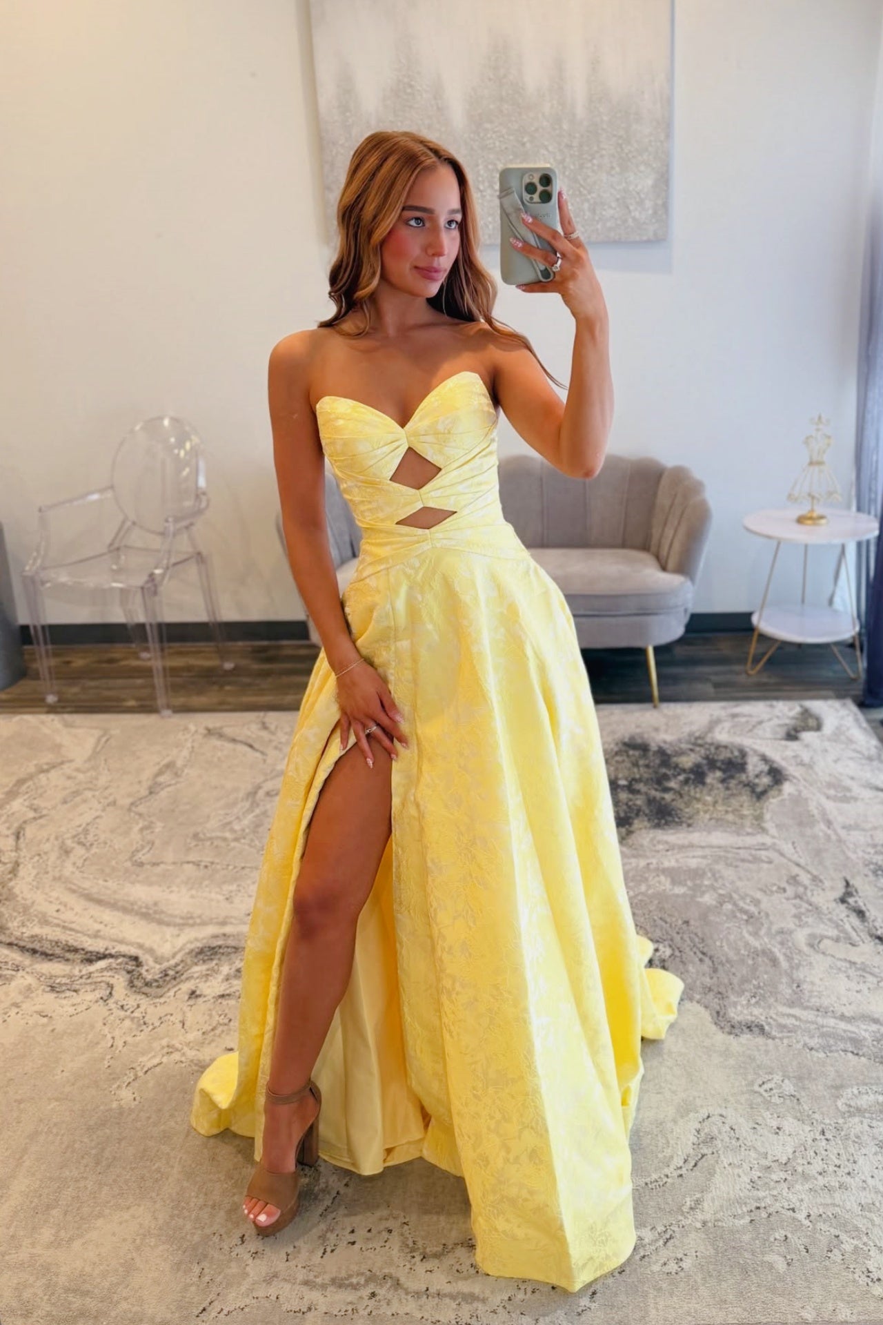 This elegant floor-length gown features a luxurious satin print fabric in a striking hot yellow hue, designed to make a statement at any formal occasion. The flattering A-line silhouette is anchored by a romantic sweetheart neckline and complemented by a daring bust cutout that adds contemporary flair. The dress showcases a high side slit for ease of movement, while the open back and lace-up closure create an alluring silhouette. Tiered ruffles add dimension and texture throughout, and a short train provides a touch of drama as you move. Perfect for those seeking a bold, sophisticated look with modern design details.