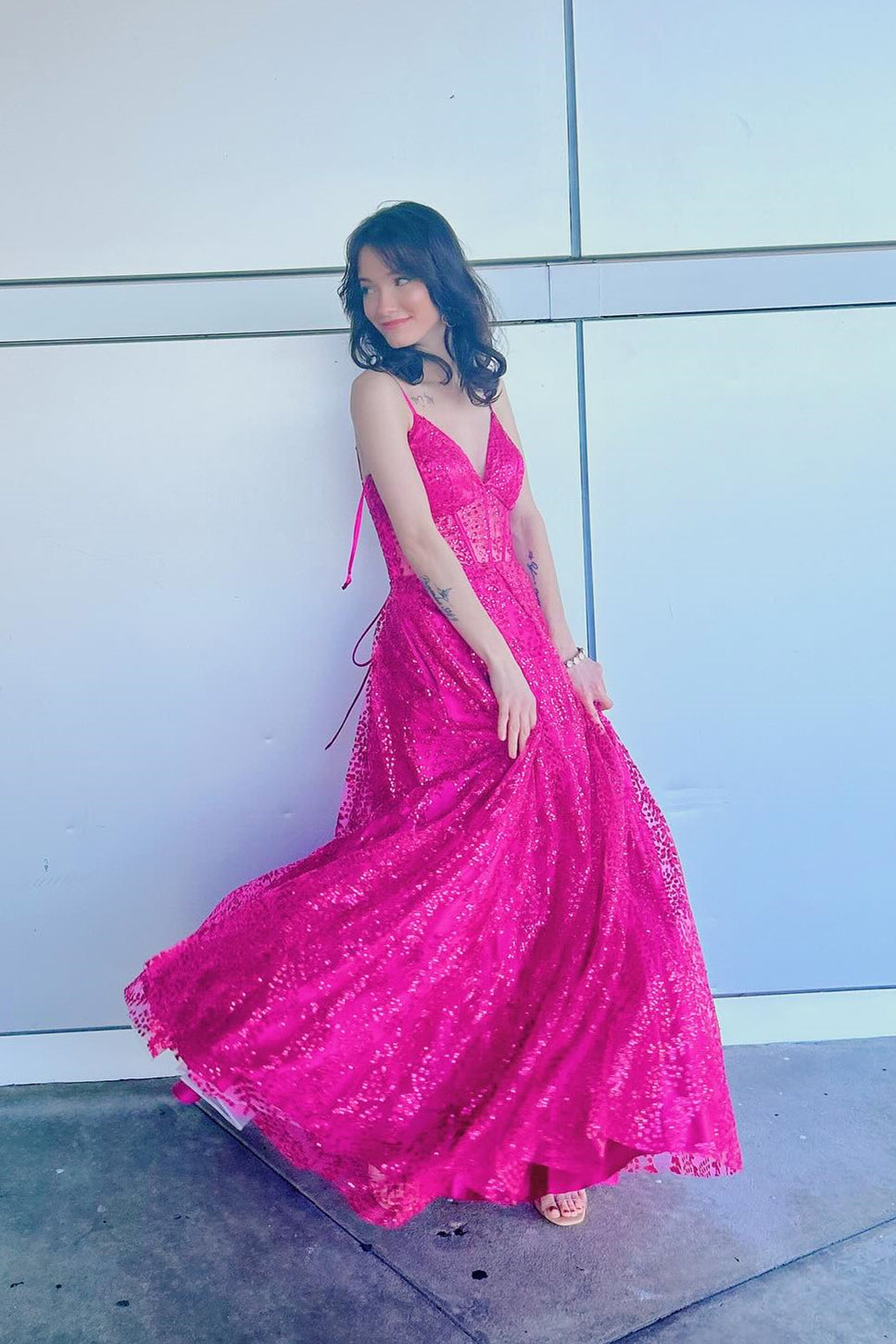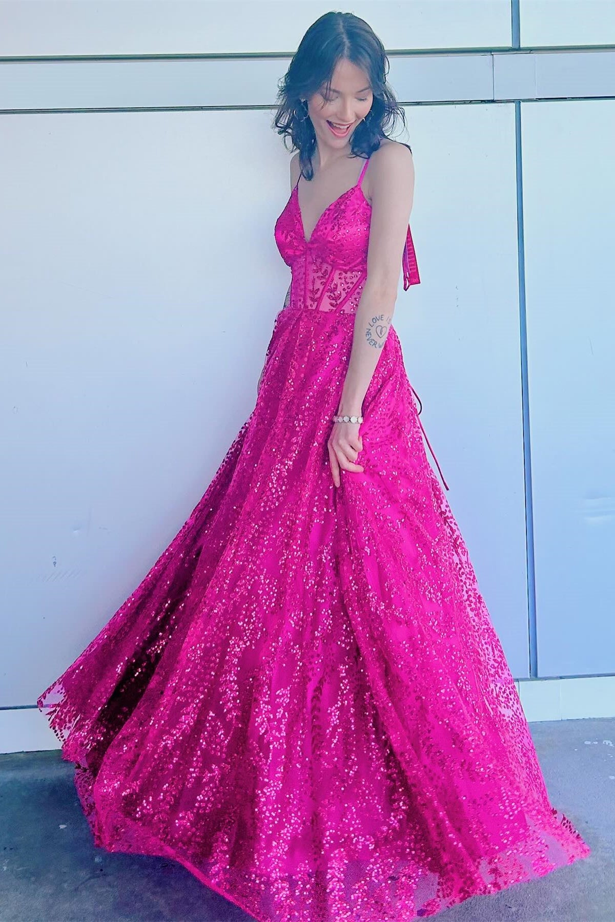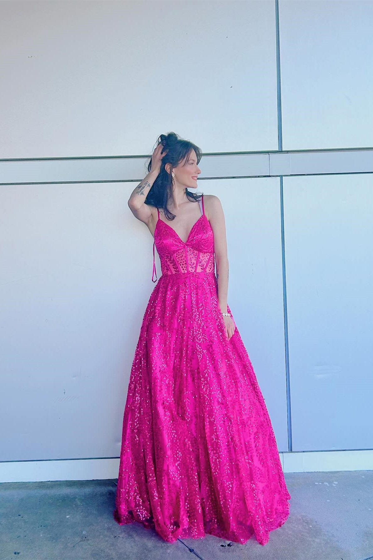 Straps Fuchsia Sheer Corset A-line Long Formal Dress