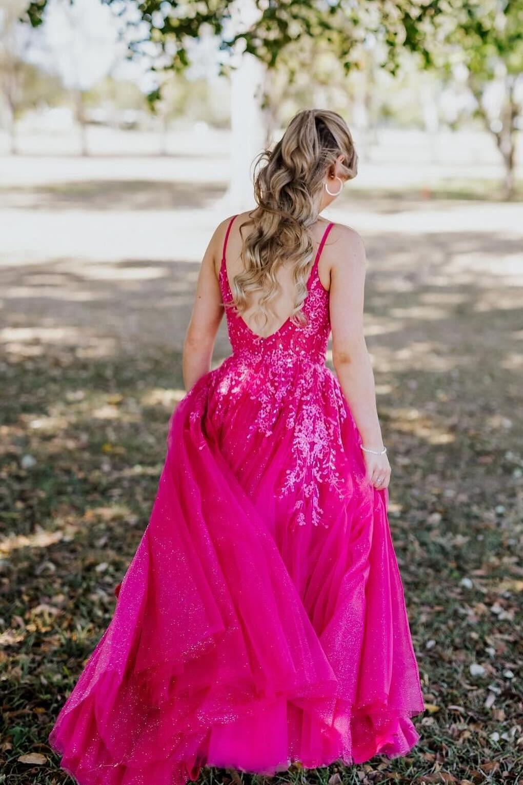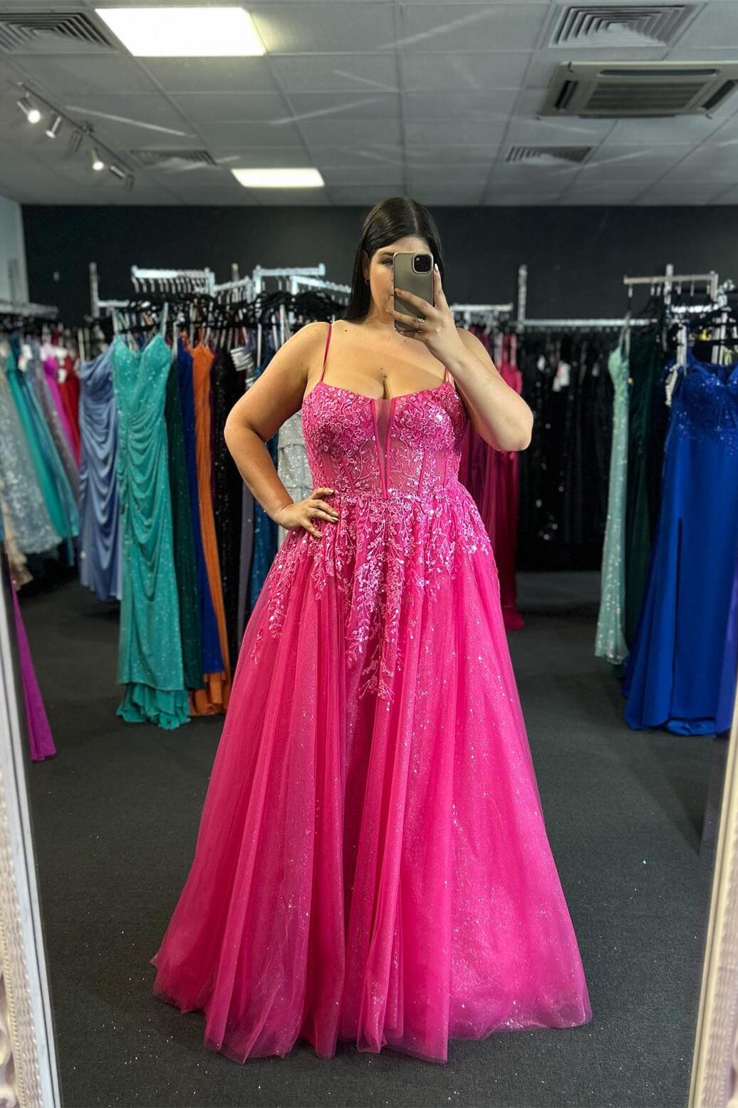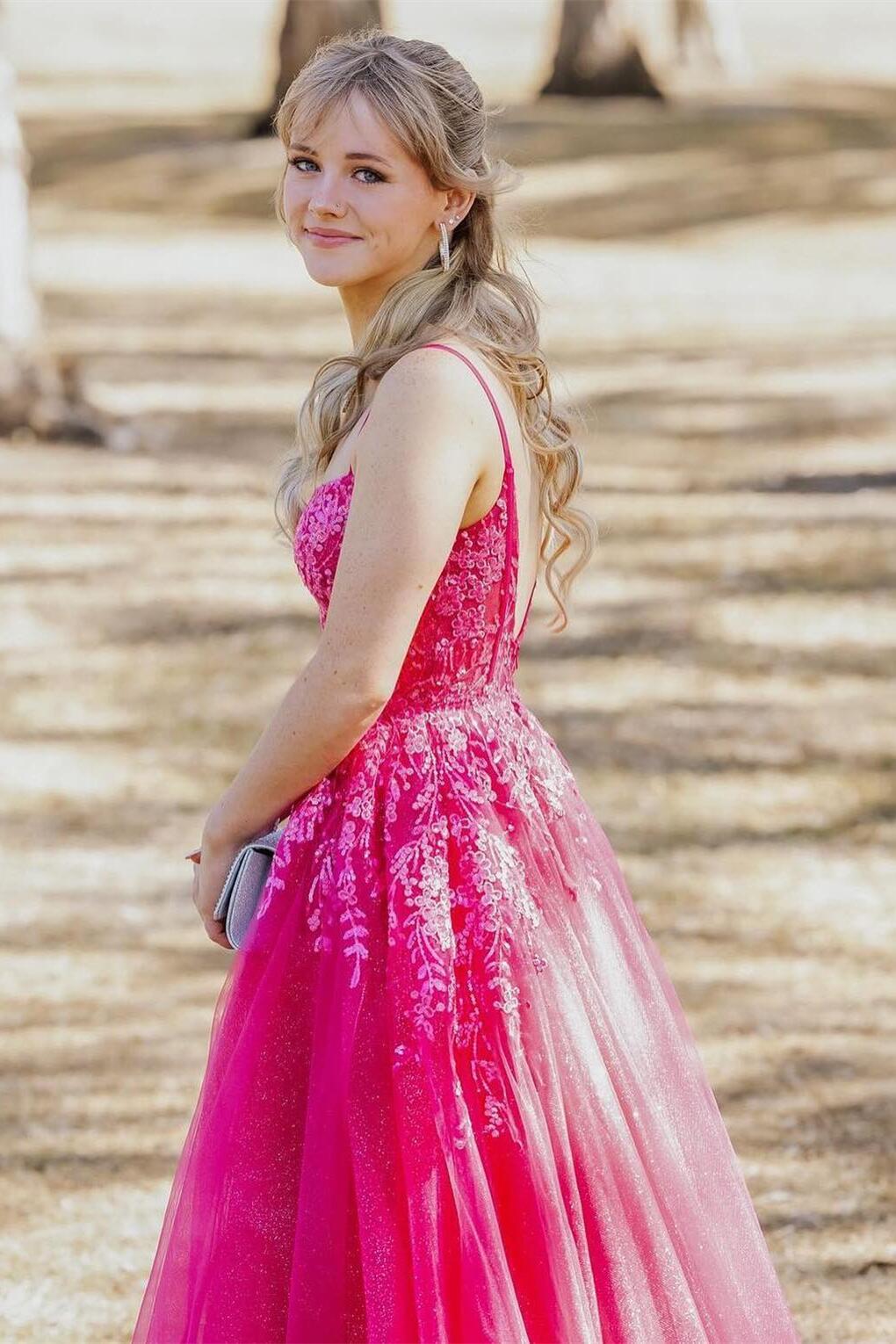 Straps Hot Pink Appliques Tulle Long Formal Gown