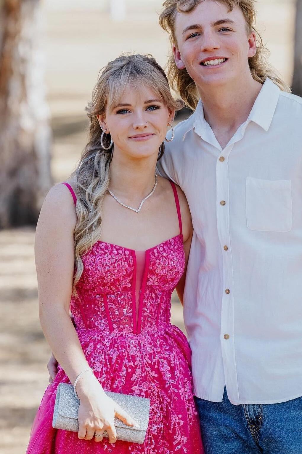 This long formal gown boasts a stunning hot pink hue crafted from tulle material. Its A-line silhouette is accentuated by spaghetti straps and delicate lace appliques, while the full length skirt and low back with zipper add a touch of elegance.