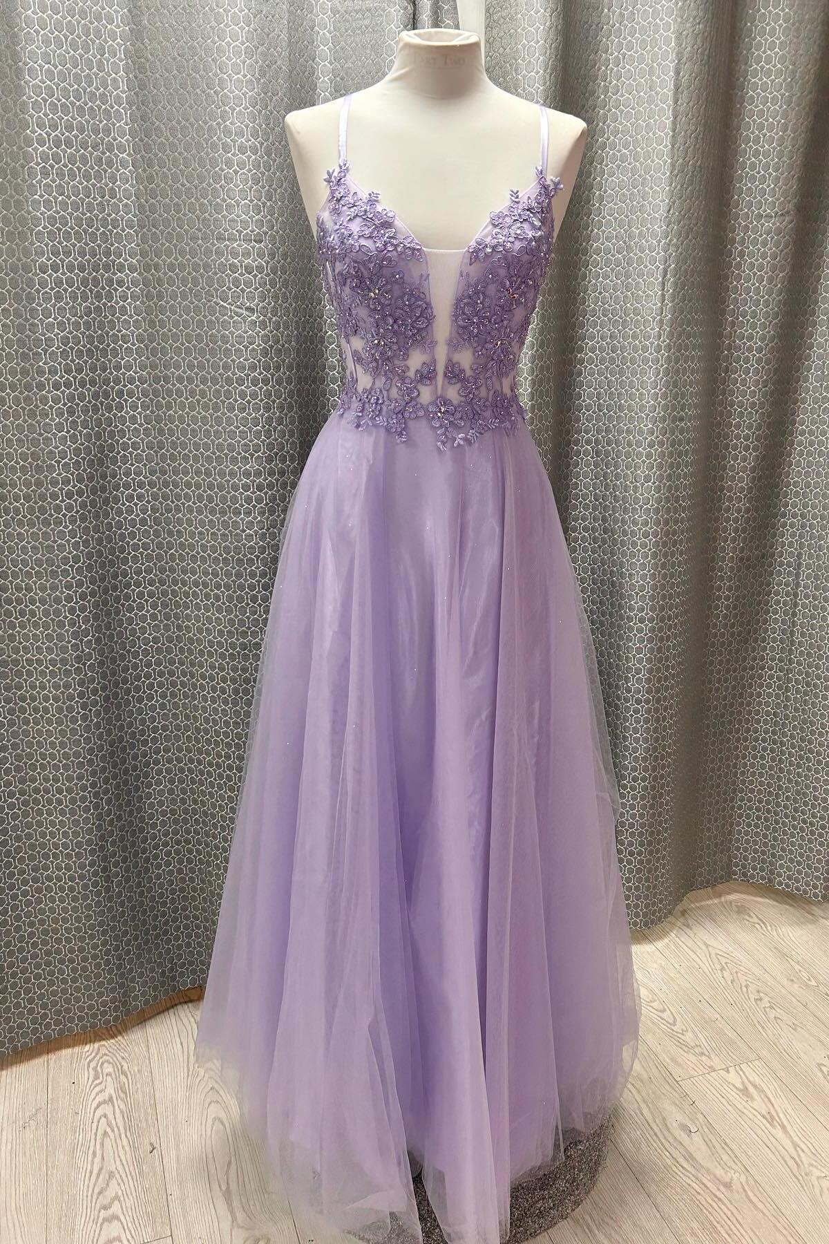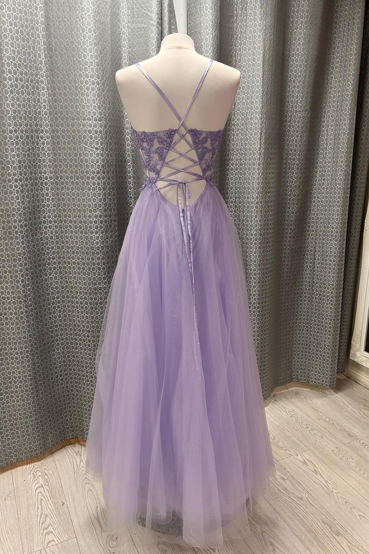 Straps Lavender Lace Appliques A-line Long Prom Dress