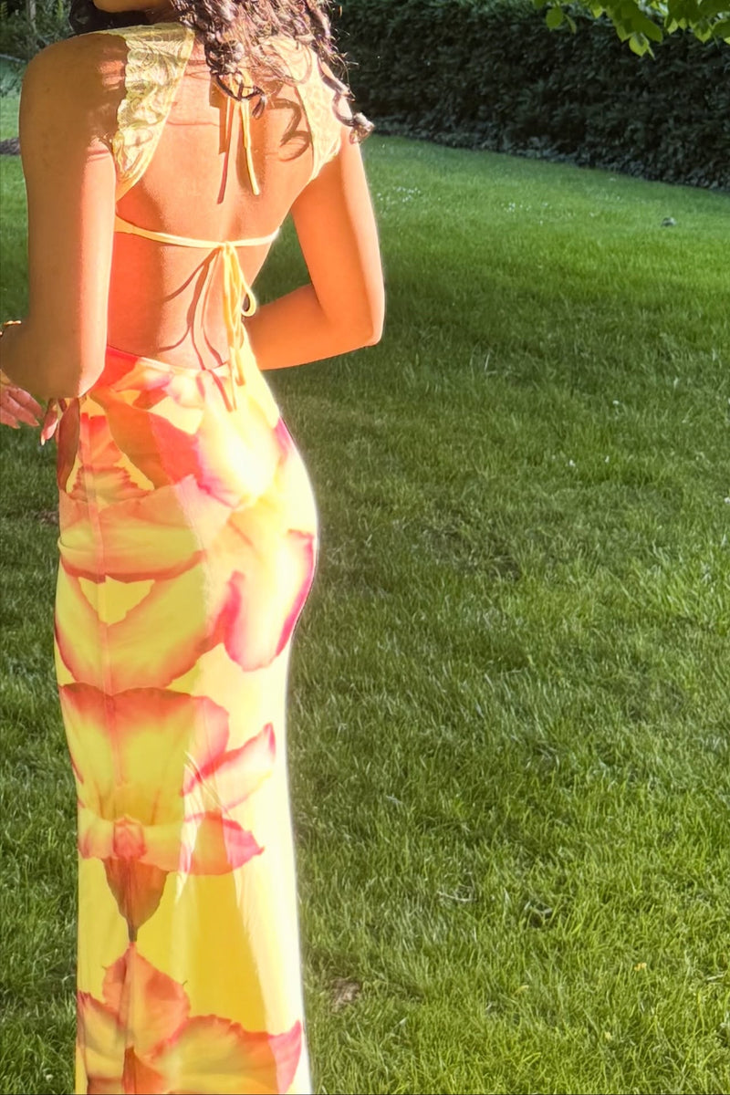 Yellow 3D Embroidered Pattern Back Tie Dress