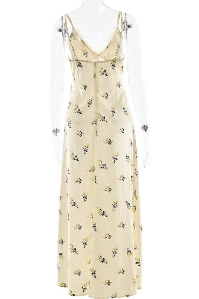Yellow Print Lace Trim Spaghetti Strap Dress
