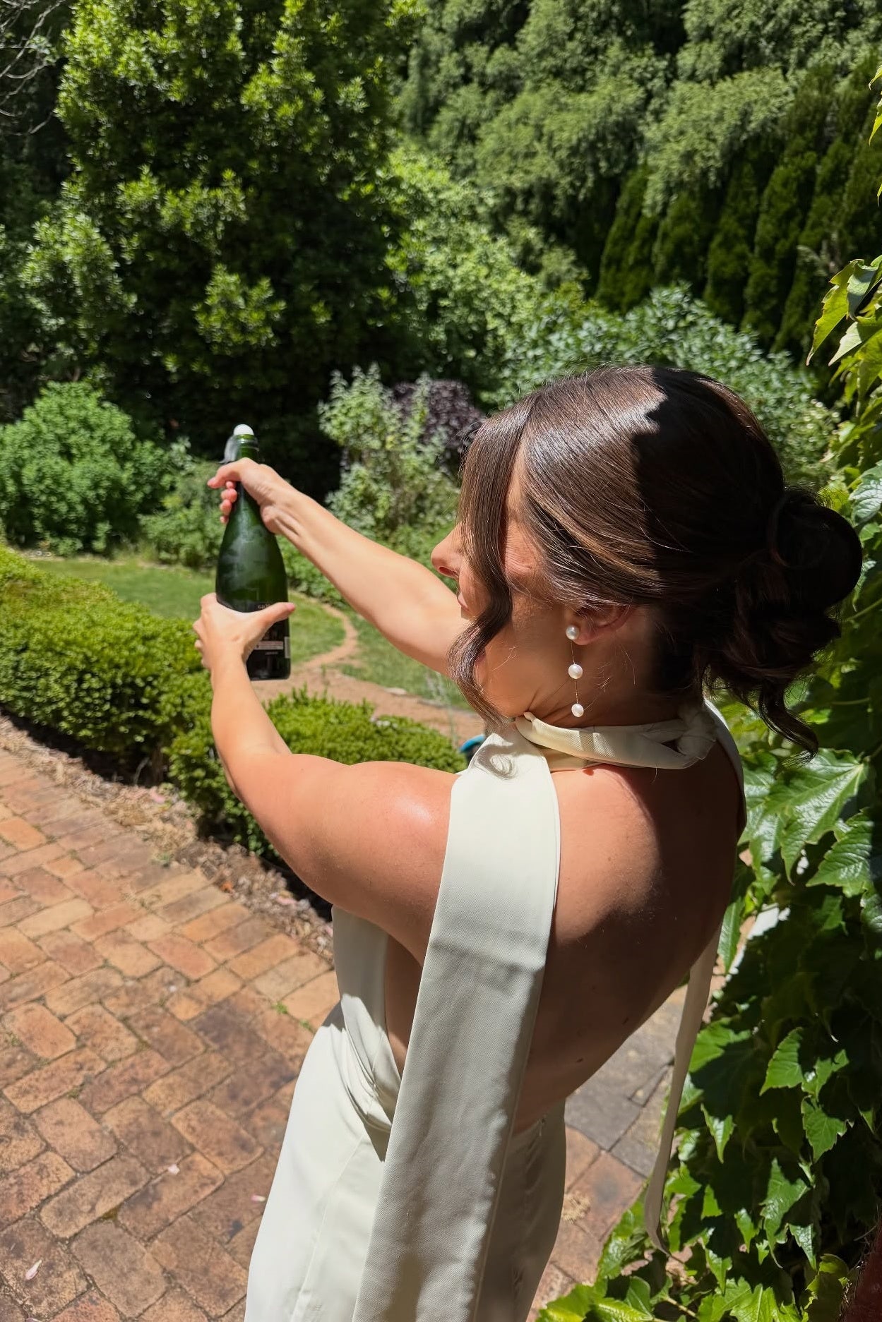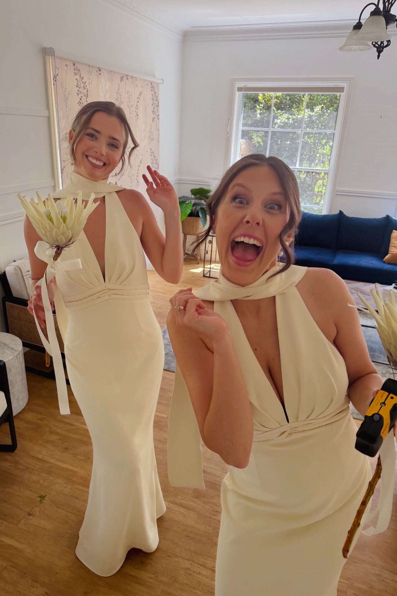 - Halter tie deep V-neckline