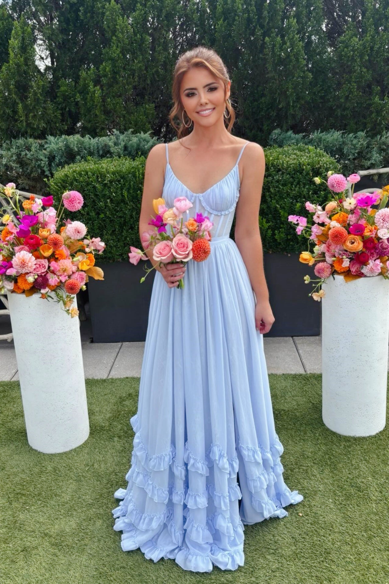 - Hem adorned with ruffle details