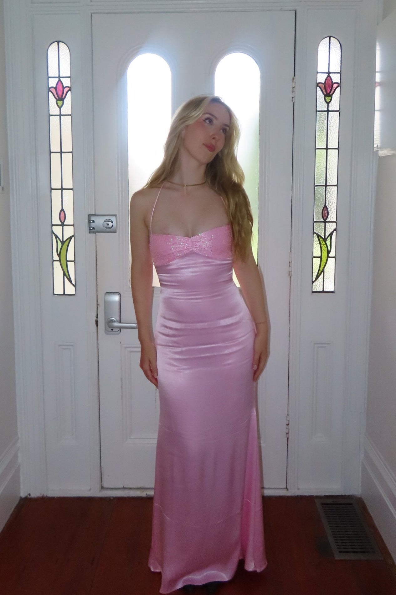 This fitted bridesmaid dress in rich burgundy features a satin bodycon silhouette with a sweetheart neckline and a halter tie closure. Detailed with delicate beading and a flowing hem, the fabric offers a subtle sheen that enhances its elegant appeal.