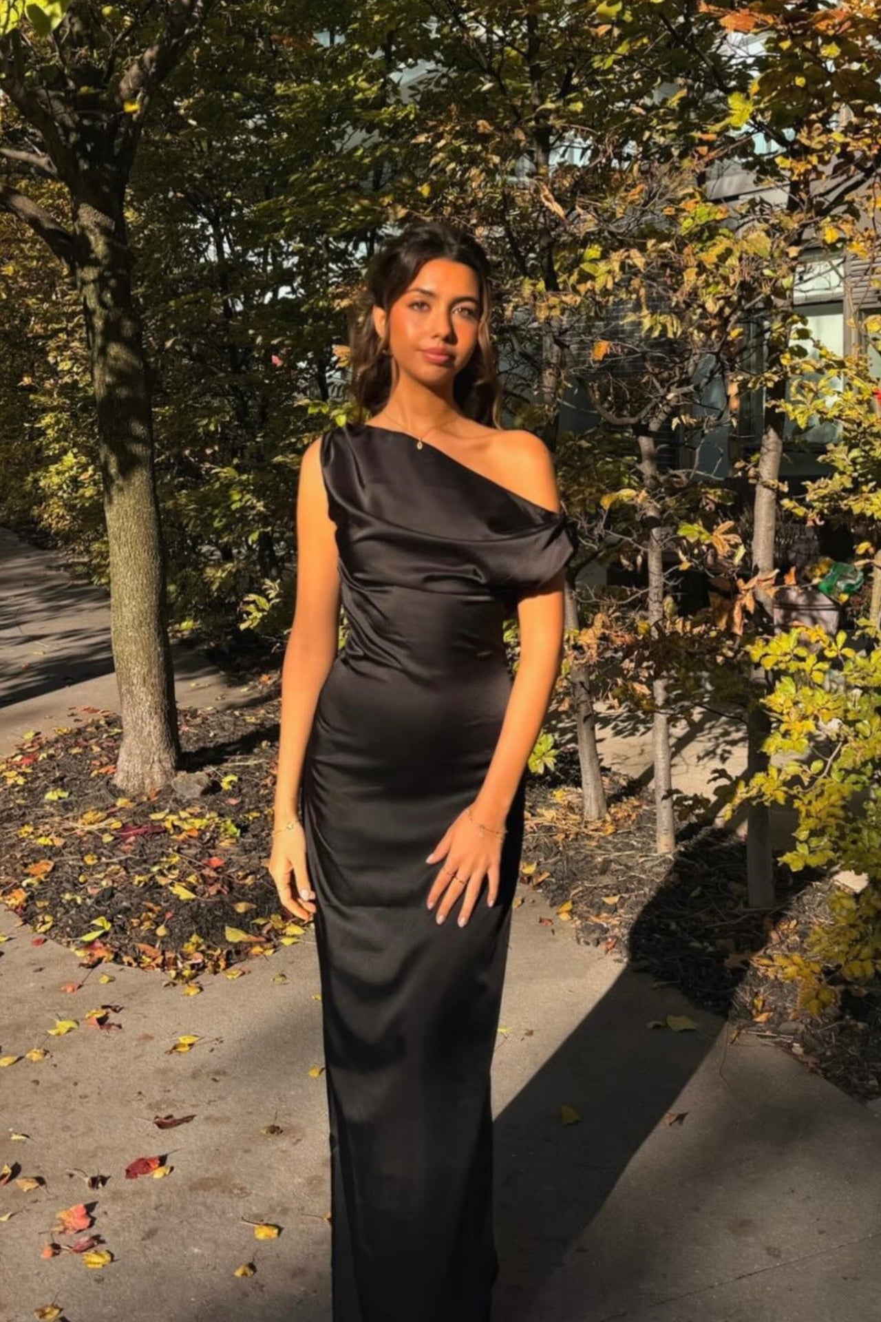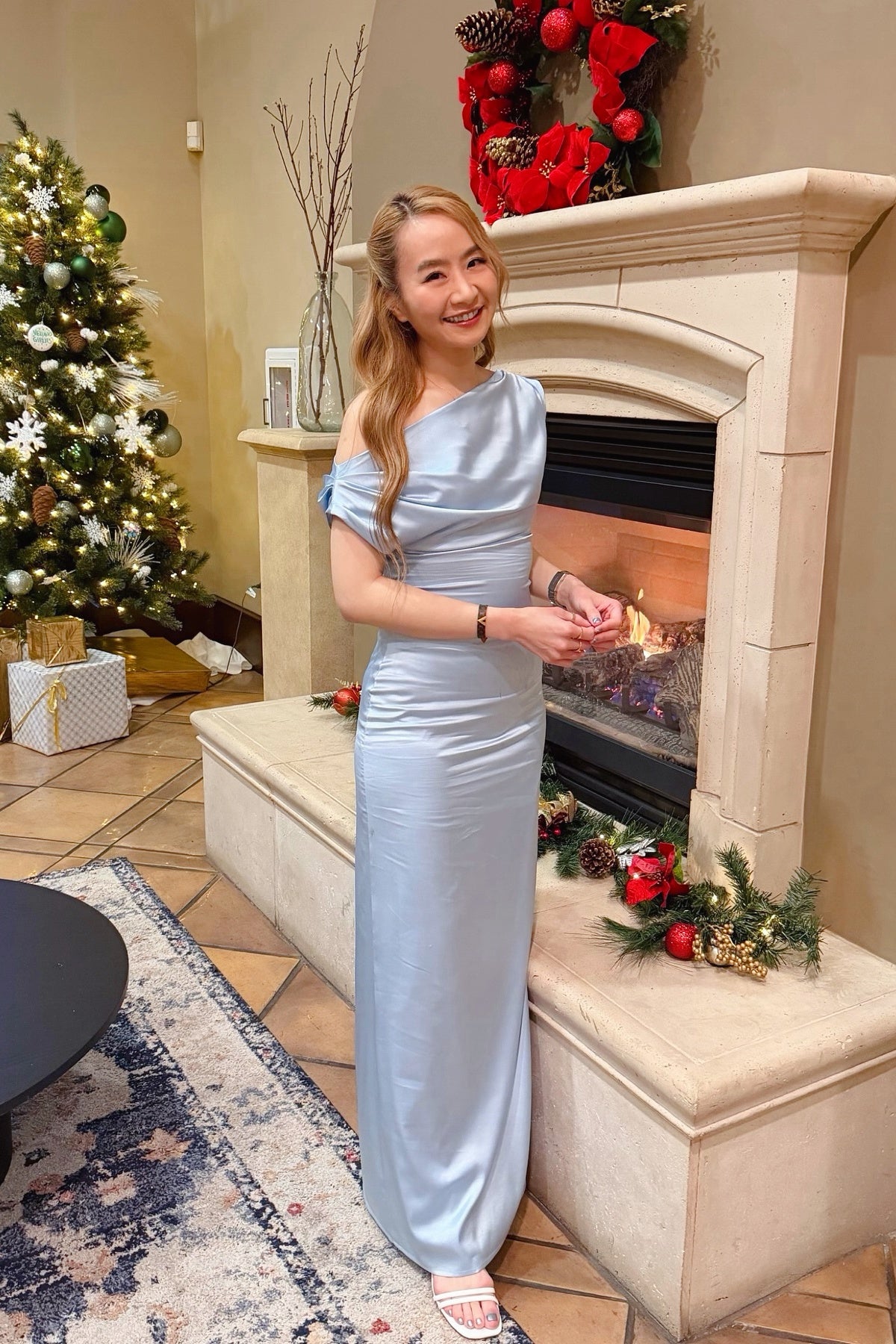 Light blue fitted dress featuring an asymmetric neckline, satin fabric, and dramatic back leg slit. Floor-length silhouette with back zipper closure for an elegant, sophisticated look.