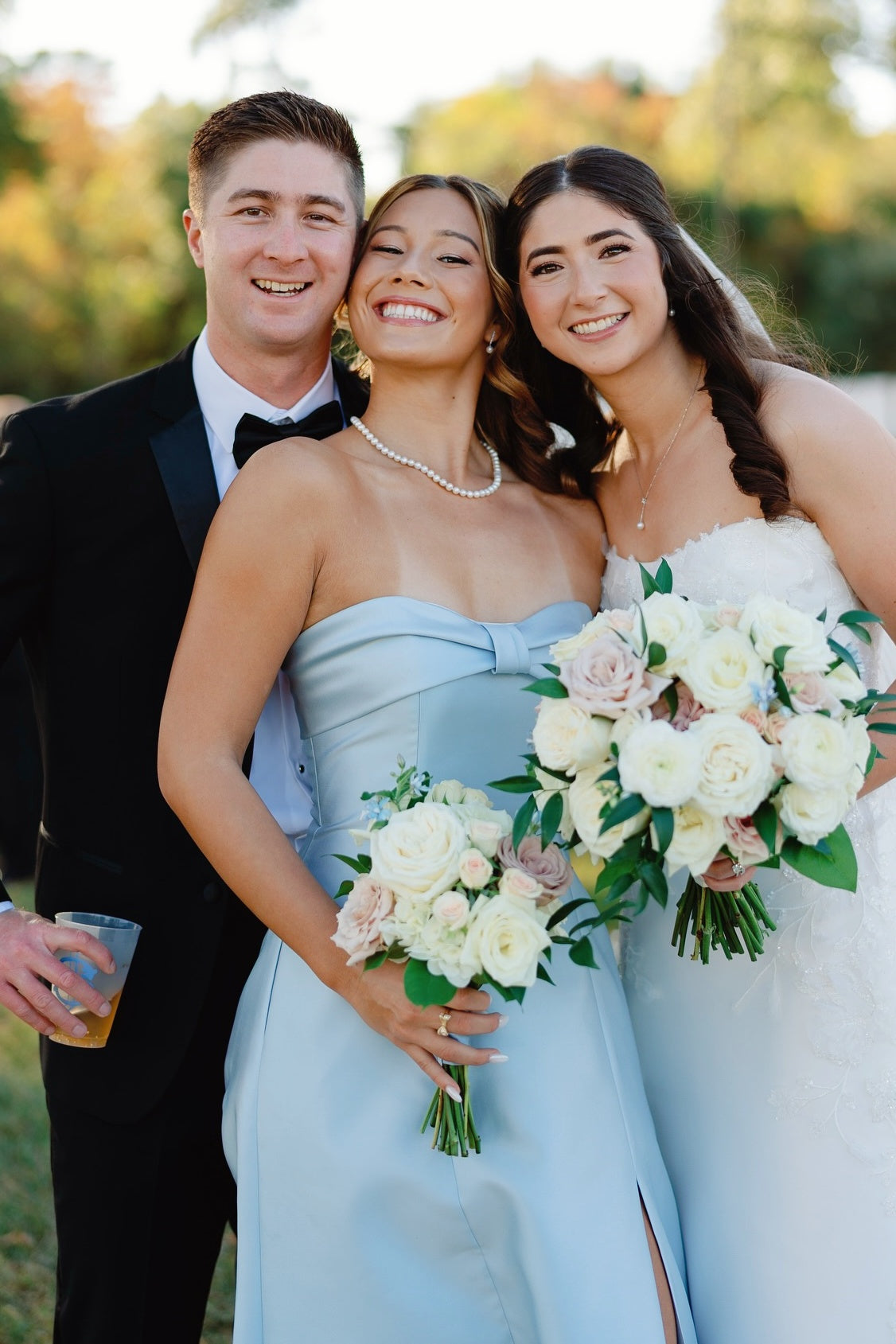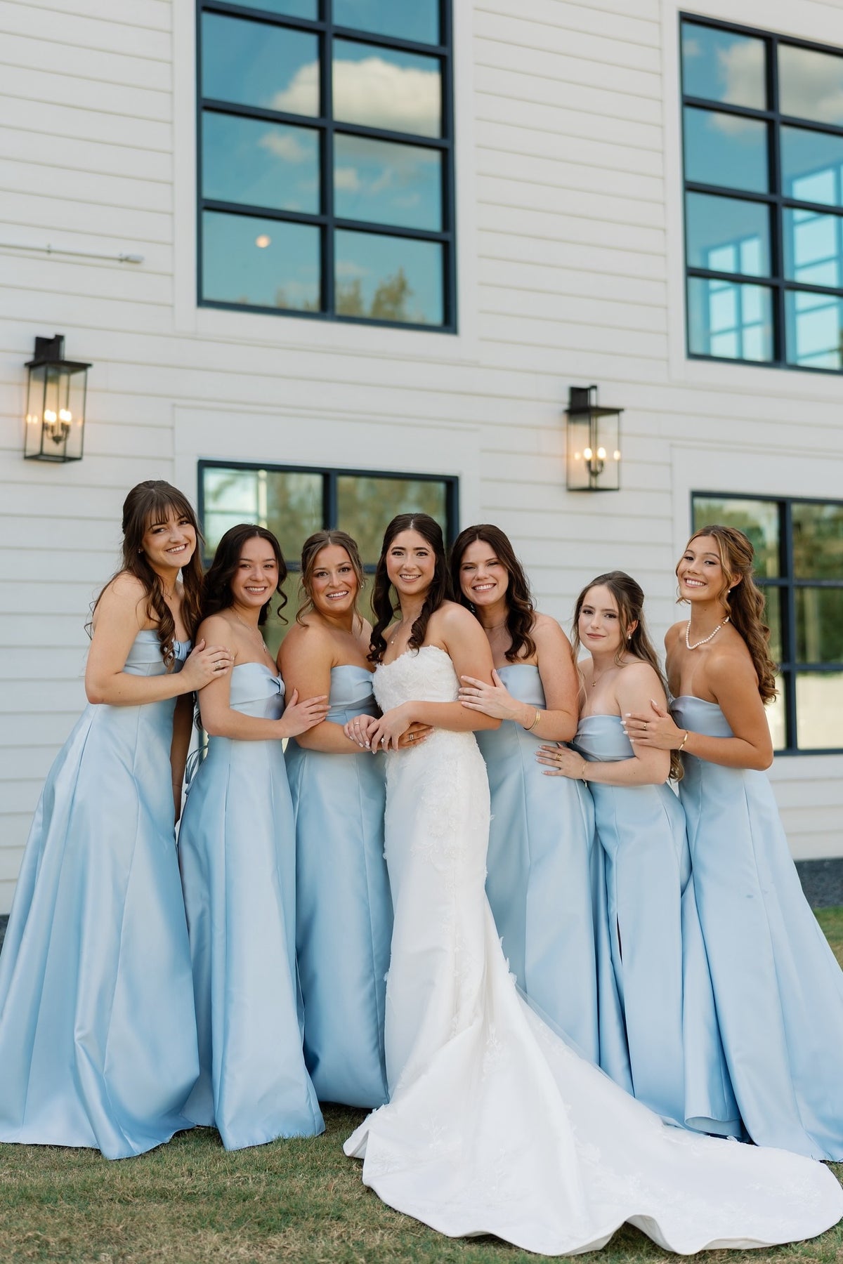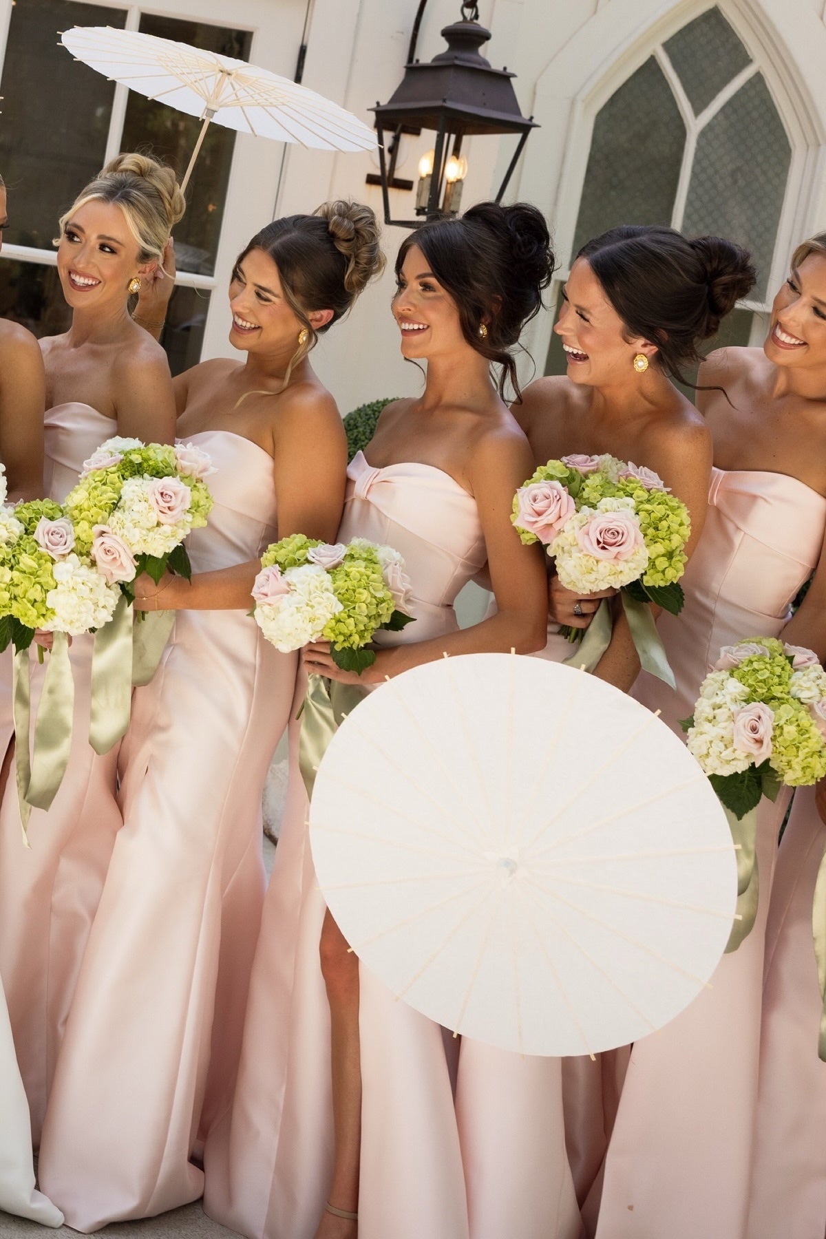 Light blue satin A-line dress featuring a strapless neckline with an elegant front bow, side slit, and full-length cut. Back zipper closure for easy wear.