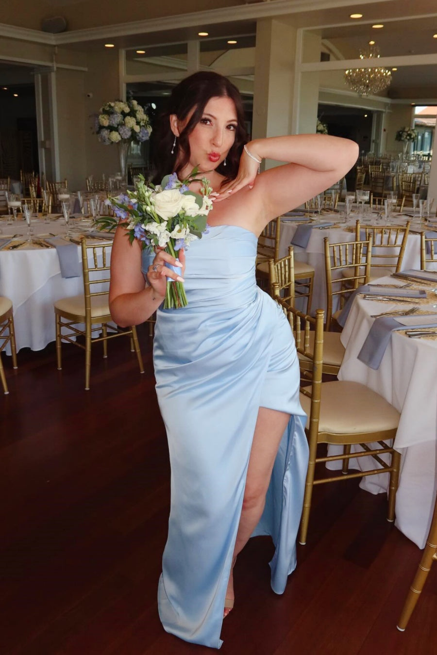 Light Blue Pleated Strapless Slit Bridesmaid Dress