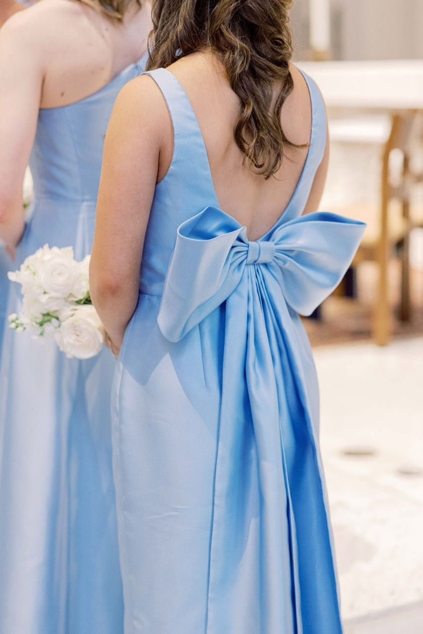 Made with luxurious satin material, this elegant dress features a fitted silhouette and a full-length V-neckline. Complete with a beautiful bow on the back, it is the perfect choice for any formal occasion.