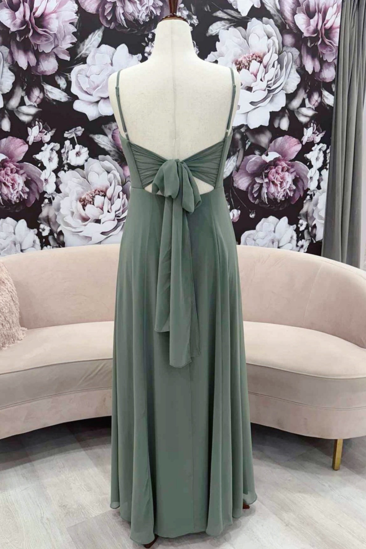 Elegant sage green chiffon A-line dress featuring delicate spaghetti straps, ruched bodice detailing, and a flattering full-length silhouette. Finished with a lace-up back closure for a refined, timeless look perfect for formal occasions.