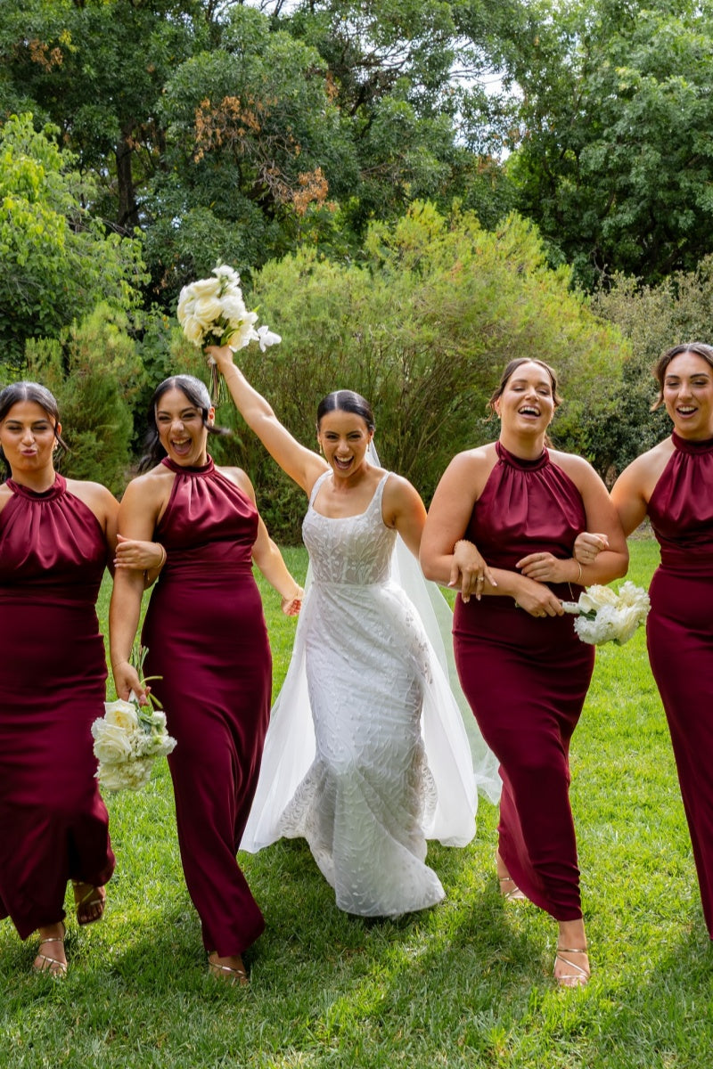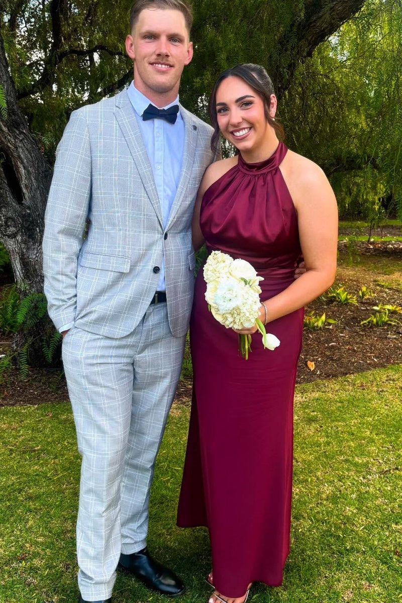 Champagne Halter Satin Fitted Bridesmaid Dress