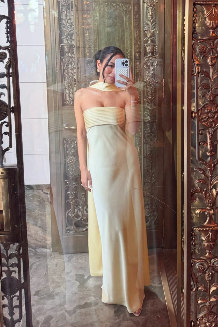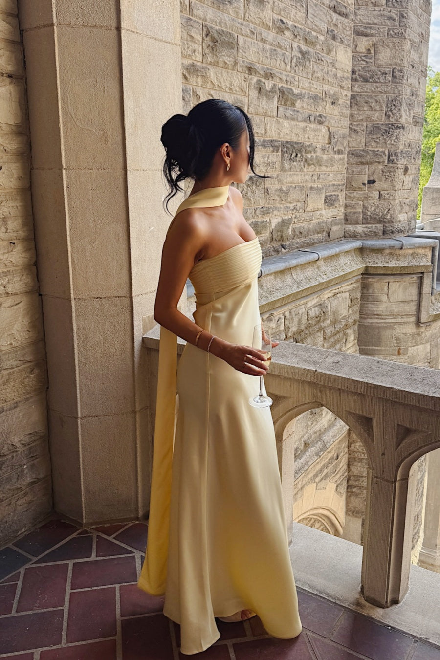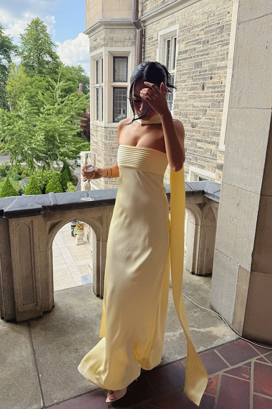 This stunning yellow satin dress features a flattering strapless neckline and a fitted silhouette that beautifully accentuates your figure. The pleated bust design adds texture and elegance to the dress, while the full-length skirt creates a graceful, timeless look. Finished with a back zipper closure, this dress is perfect for formal occasions, weddings, or any event where you want to make a sophisticated statement.