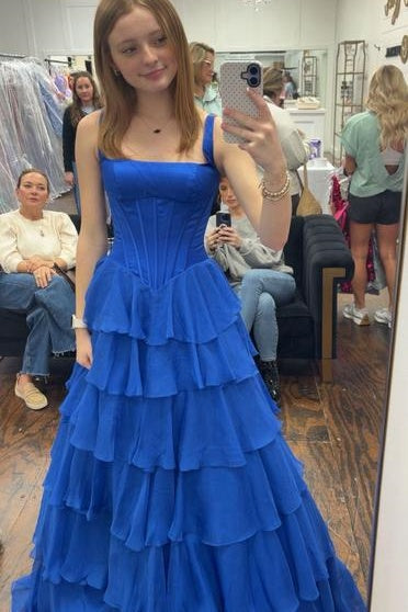 This hot pink maxi dress combines elegance with dramatic flair. The fitted satin bustier features boning for structure, while the flowing chiffon skirt creates a graceful A-line silhouette. A square neckline, side slit, and layered ruffle hem add movement and sophistication, while the lace-up back provides a striking finishing touch.