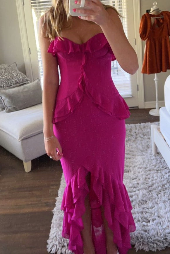Constructed from lightweight chiffon fabric and featuring a fitted silhouette, spaghetti straps, and a zip-up back, this dress offers a full, elegant length that will elevate your style with effortless grace.
