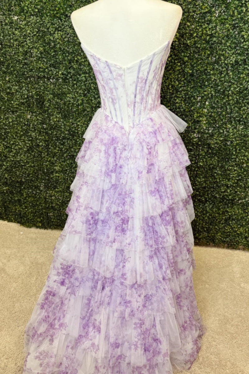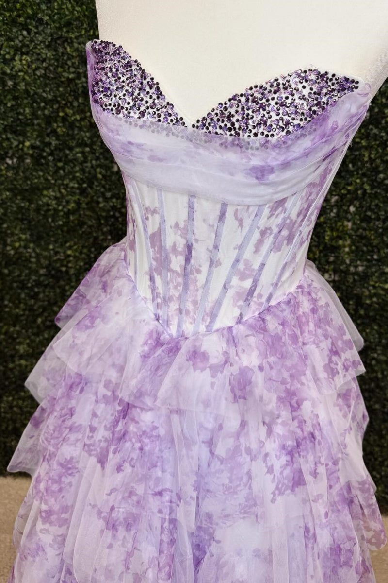 Lavender chiffon A-line prom dress with sweetheart neckline and beaded bust embellishment. Corset bodice, high side slit, and floor-length hem with back zipper.