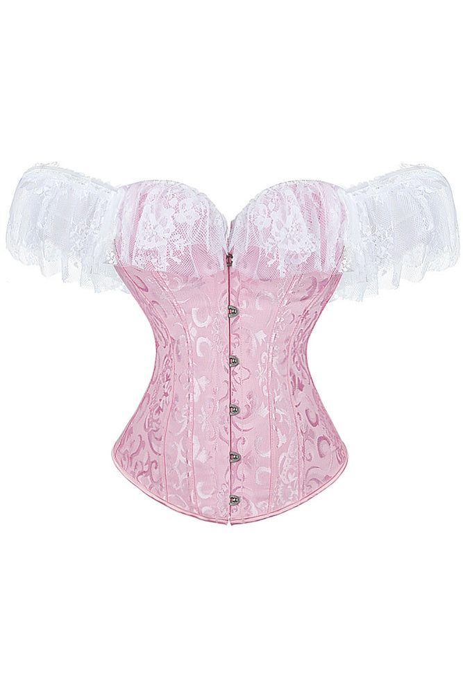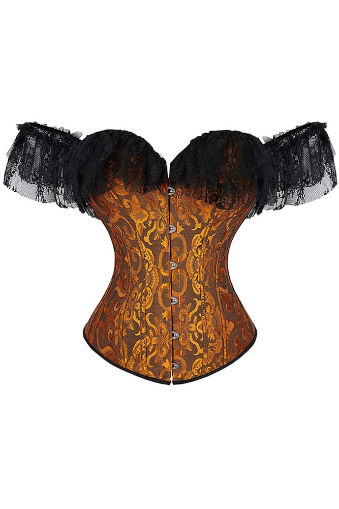 Crafted from spandex, this red off-the-shoulder bandeau top features a lace collar, floral print, and metal button details for a refined, elegant look.