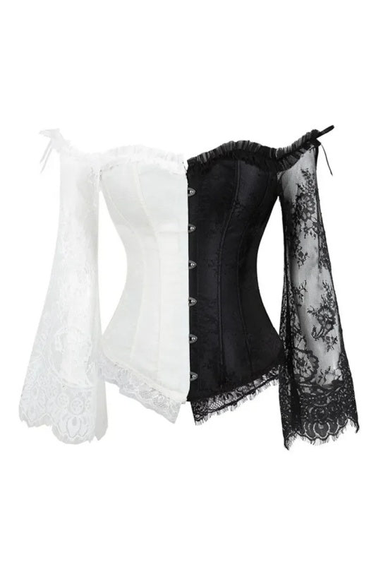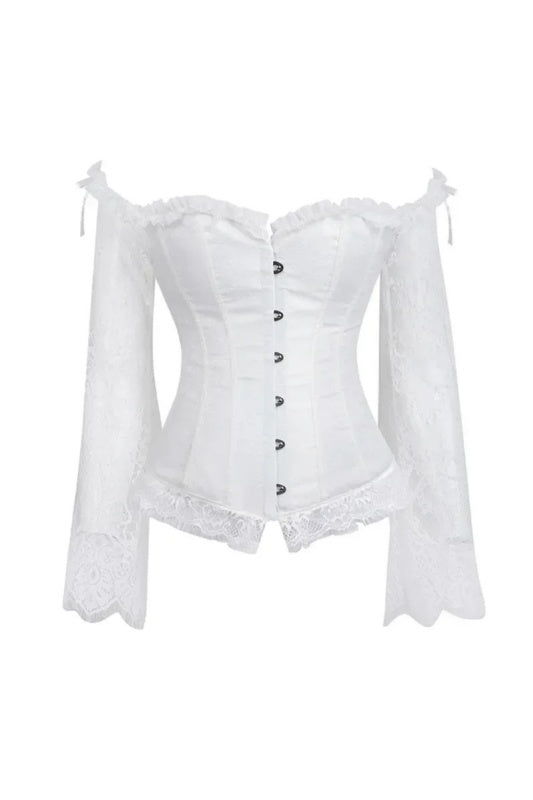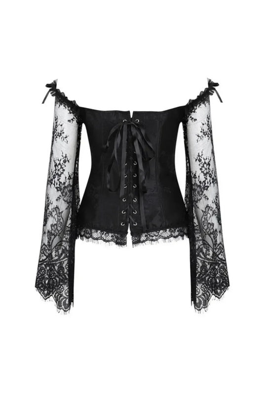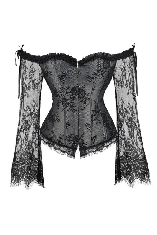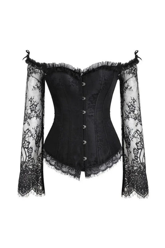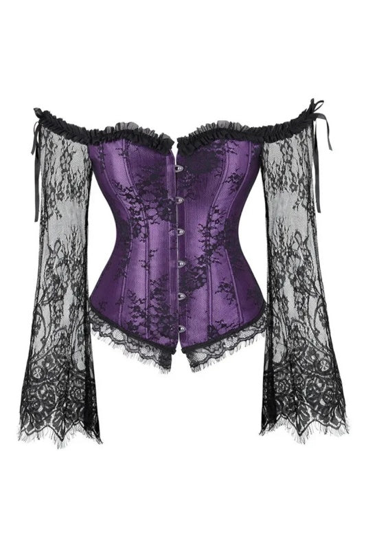 Crafted from spandex, this red off-the-shoulder bandeau top features a floral print, lace collar, and long lace sleeves, accented with metal buttons for a refined finish.