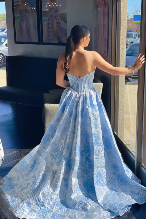 Elegant blue jacquard dress featuring a strapless corset bodice with boning, A-line silhouette, and dramatic side slit. Floor-length skirt with train and back zipper closure.