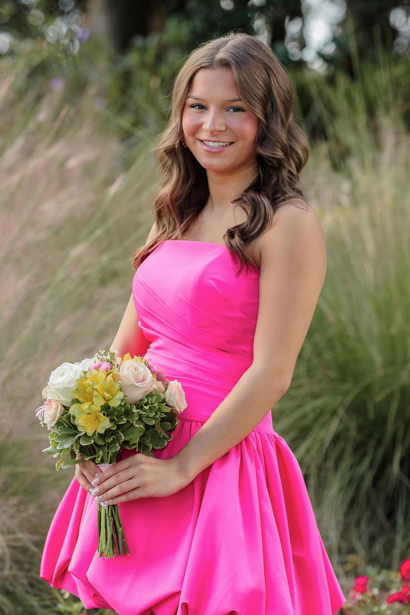 Hot Pink Ruffles Strapls Pleated A-line Short Dress