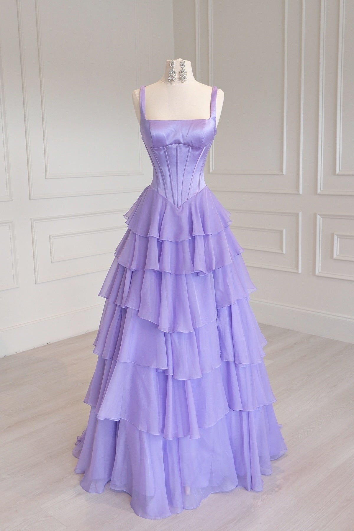 This hot pink maxi dress combines elegance with dramatic flair. The fitted satin bustier features boning for structure, while the flowing chiffon skirt creates a graceful A-line silhouette. A square neckline, side slit, and layered ruffle hem add movement and sophistication, while the lace-up back provides a striking finishing touch.