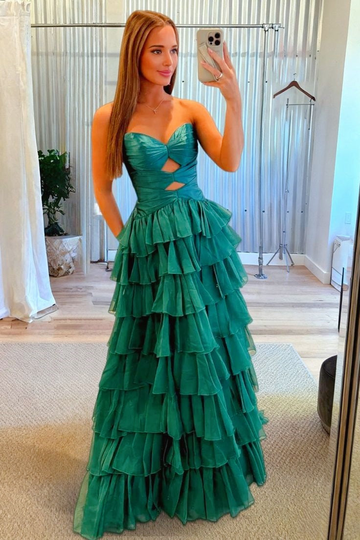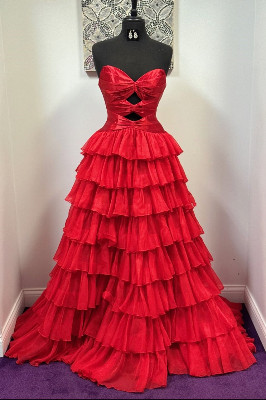 Stunning hot pink tulle A-line dress with a sweetheart neckline and strategic cut-out detailing at the bust. Features a low lace-up back, high side slit, and ruffled hem with a short train. An ideal choice for memorable evening events.