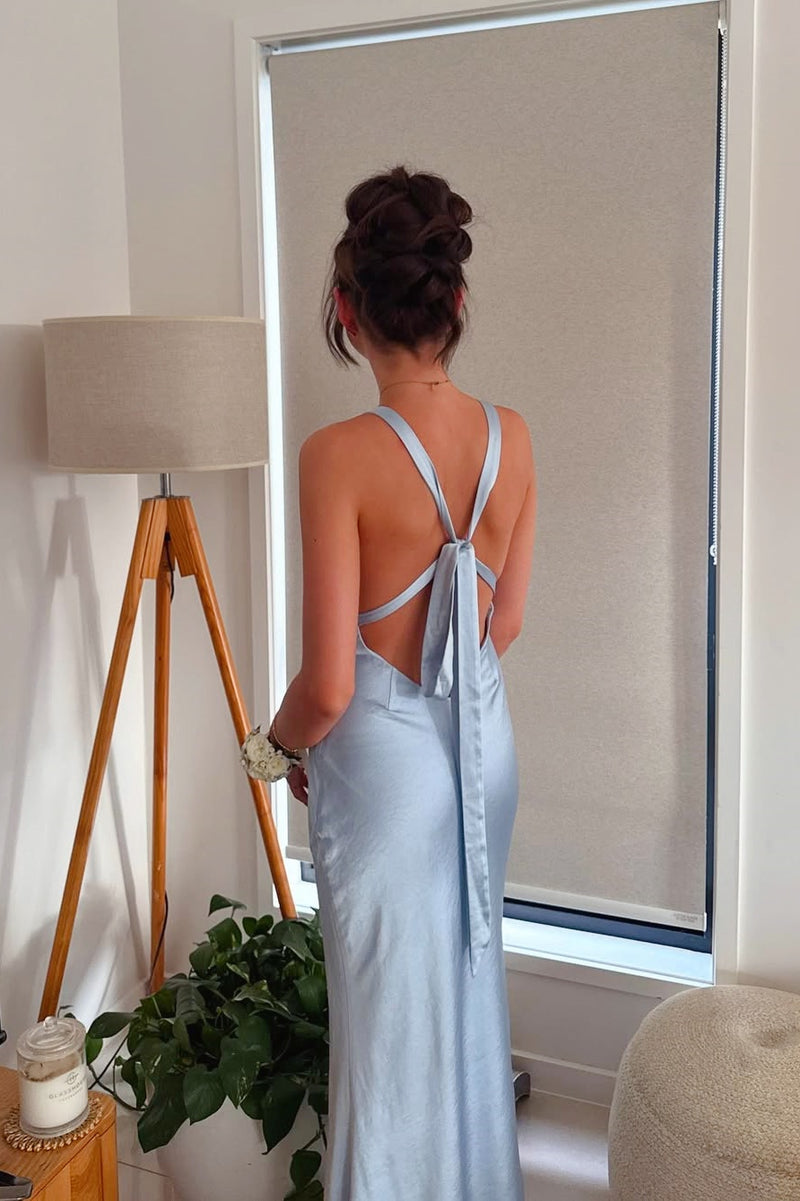 V-neck Sheer Mesh Mermaid Blue Long Dress