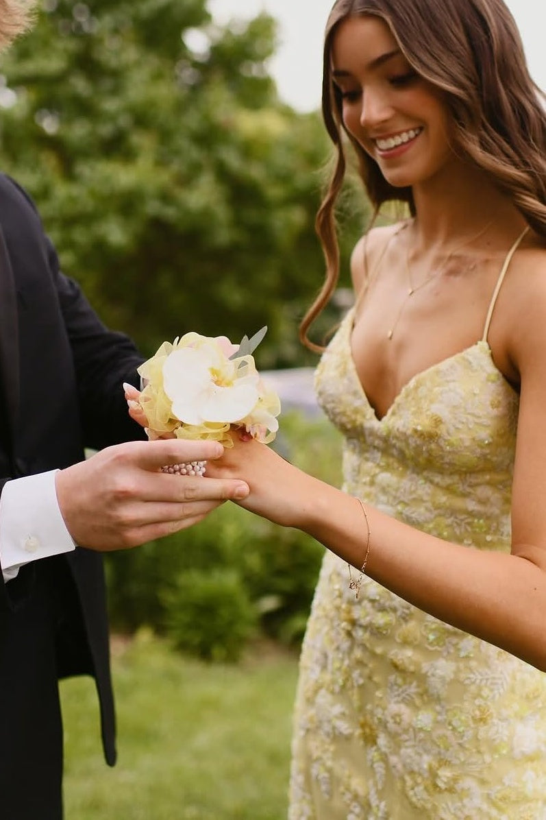 Yellow Floral Beaded Applique Mermaid Long Dress