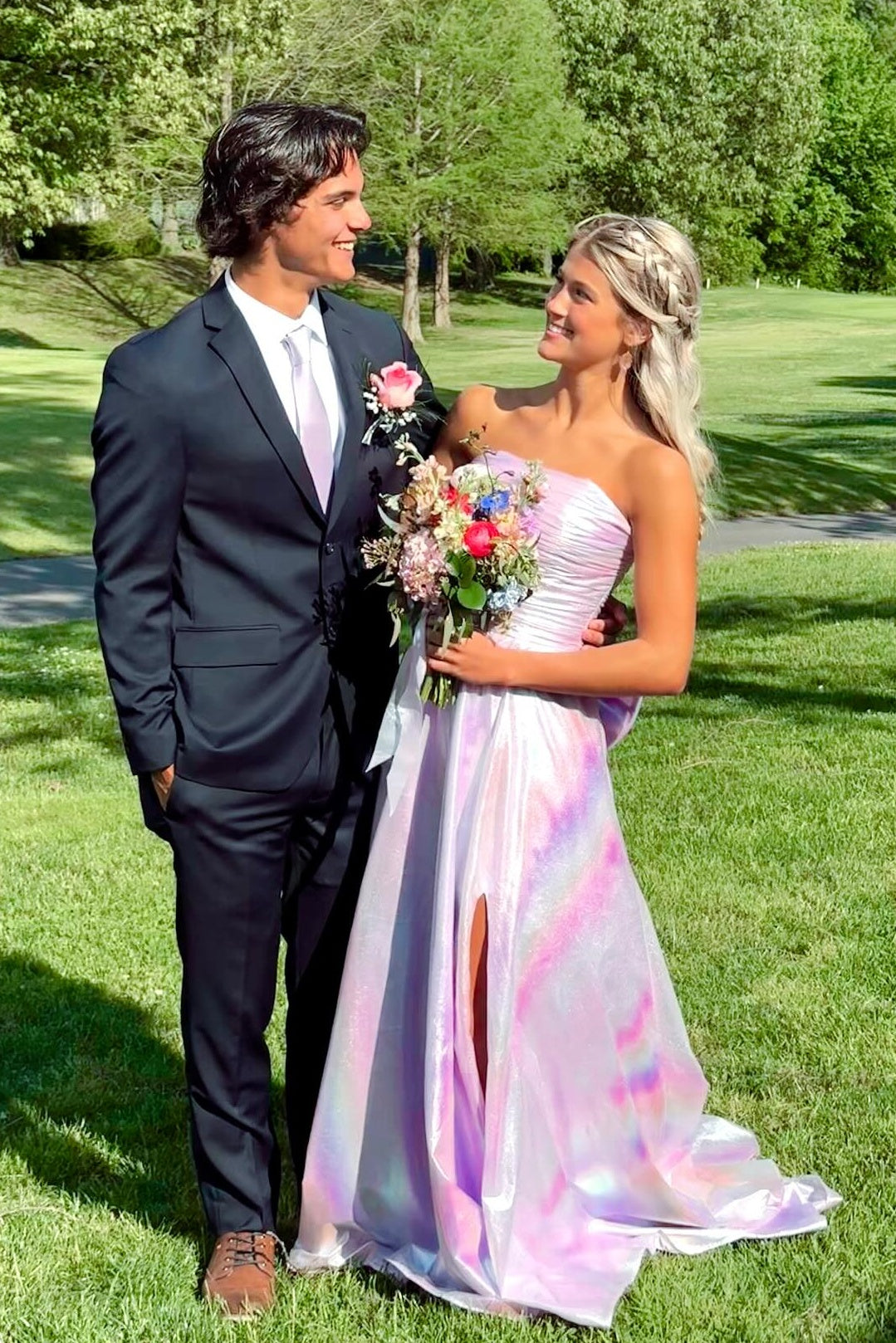 Strapless Metallic Ruched Prom Dress with Bow