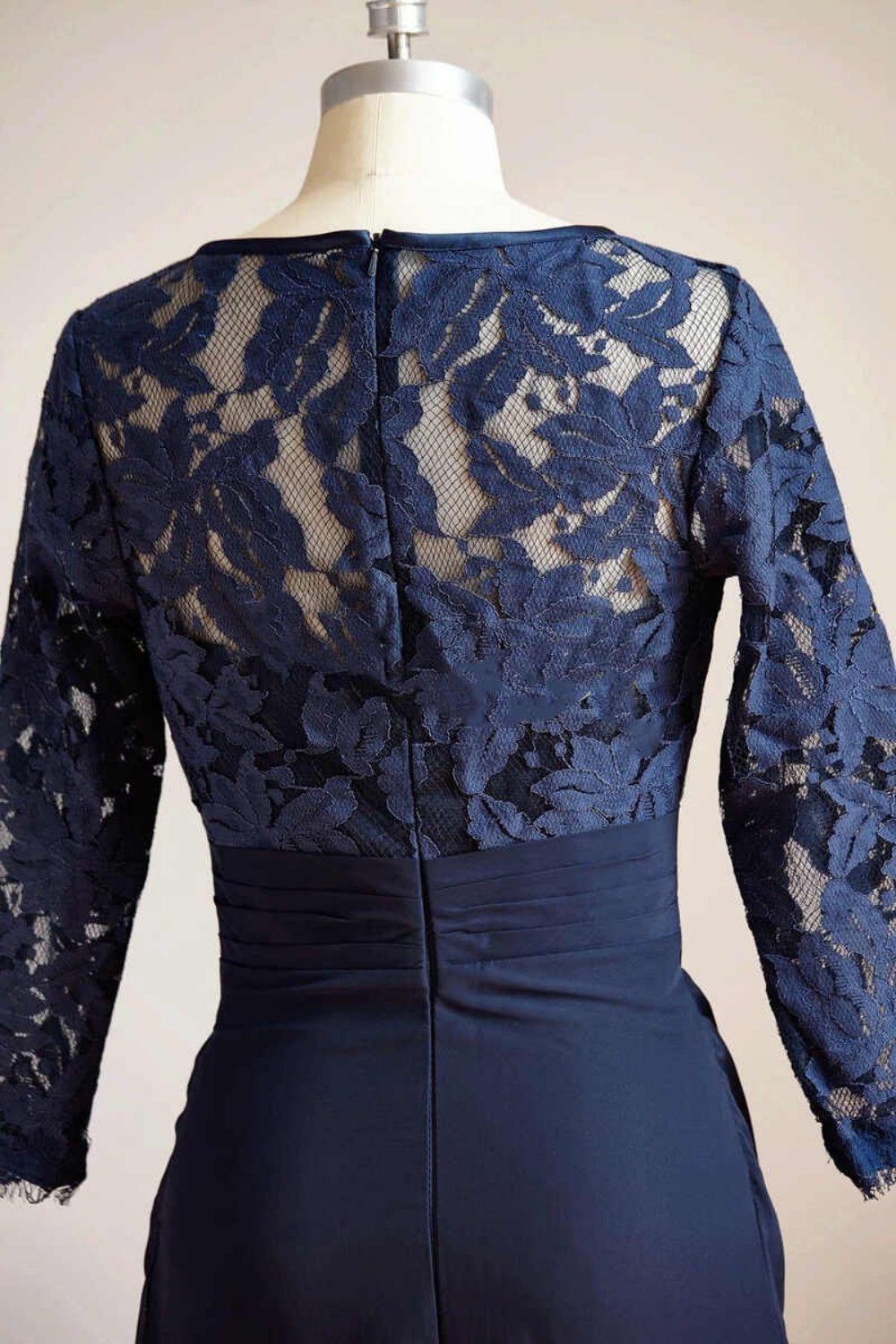 Long Sleeve Navy Blue Lace Diamond Mother of the Bride Dress with Ruffle