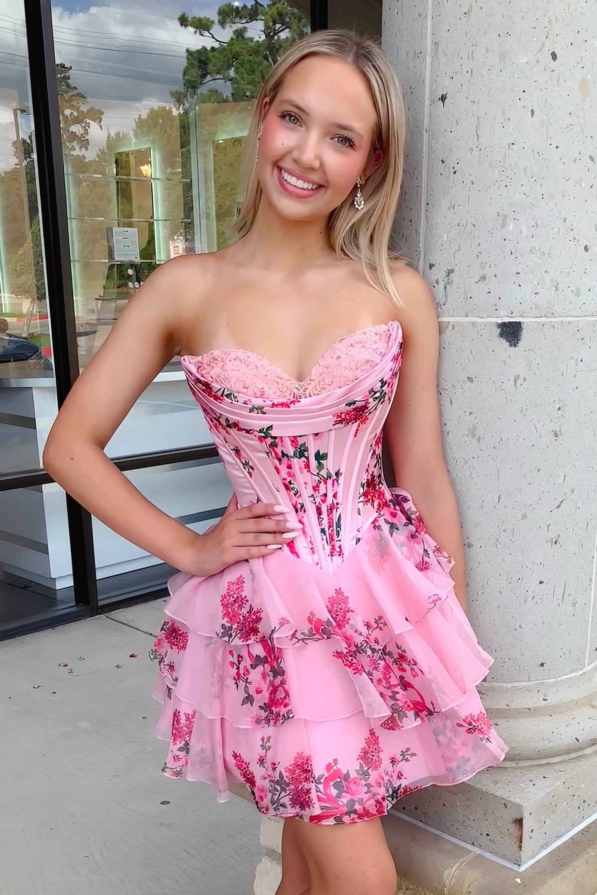 Blue Floral Print Corset A-line Short Ruffle Dress