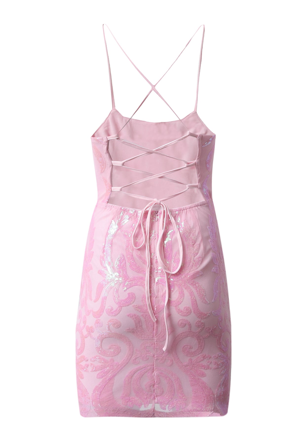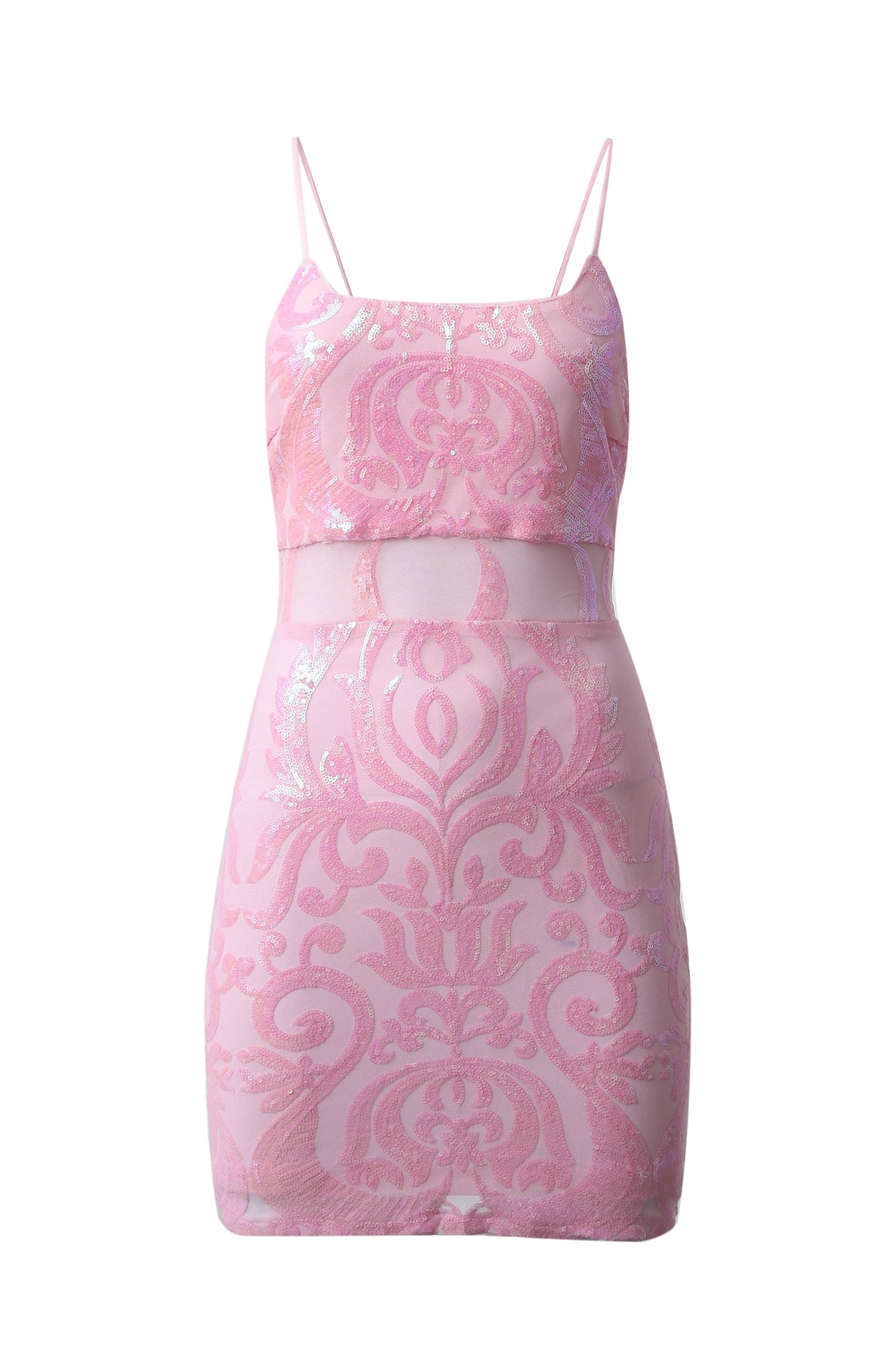 This bodycon top features a polyester fiber construction with a sheer mesh waist and intricate appliqués. It is designed with spaghetti straps and a lace-up back for a tailored fit and sophisticated appeal.