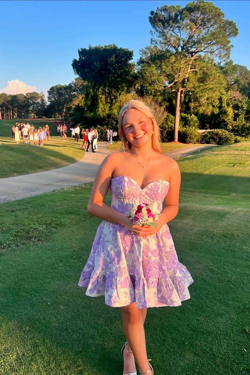 The dress features a strapless neckline and an above knee length, made with satin material in a beautiful blue floral print. The silhouette is A-line.