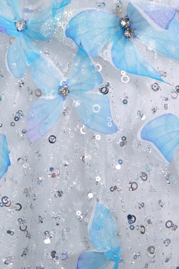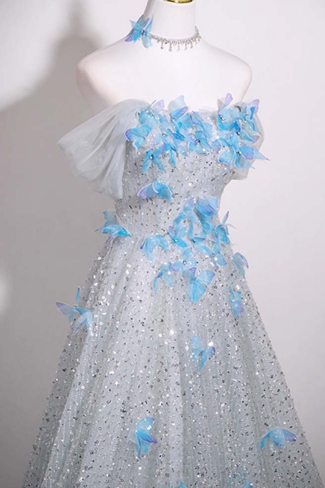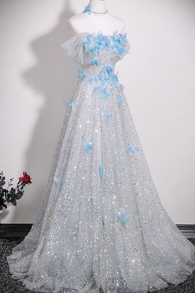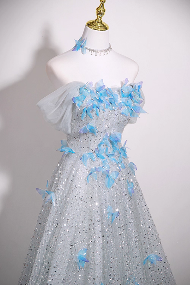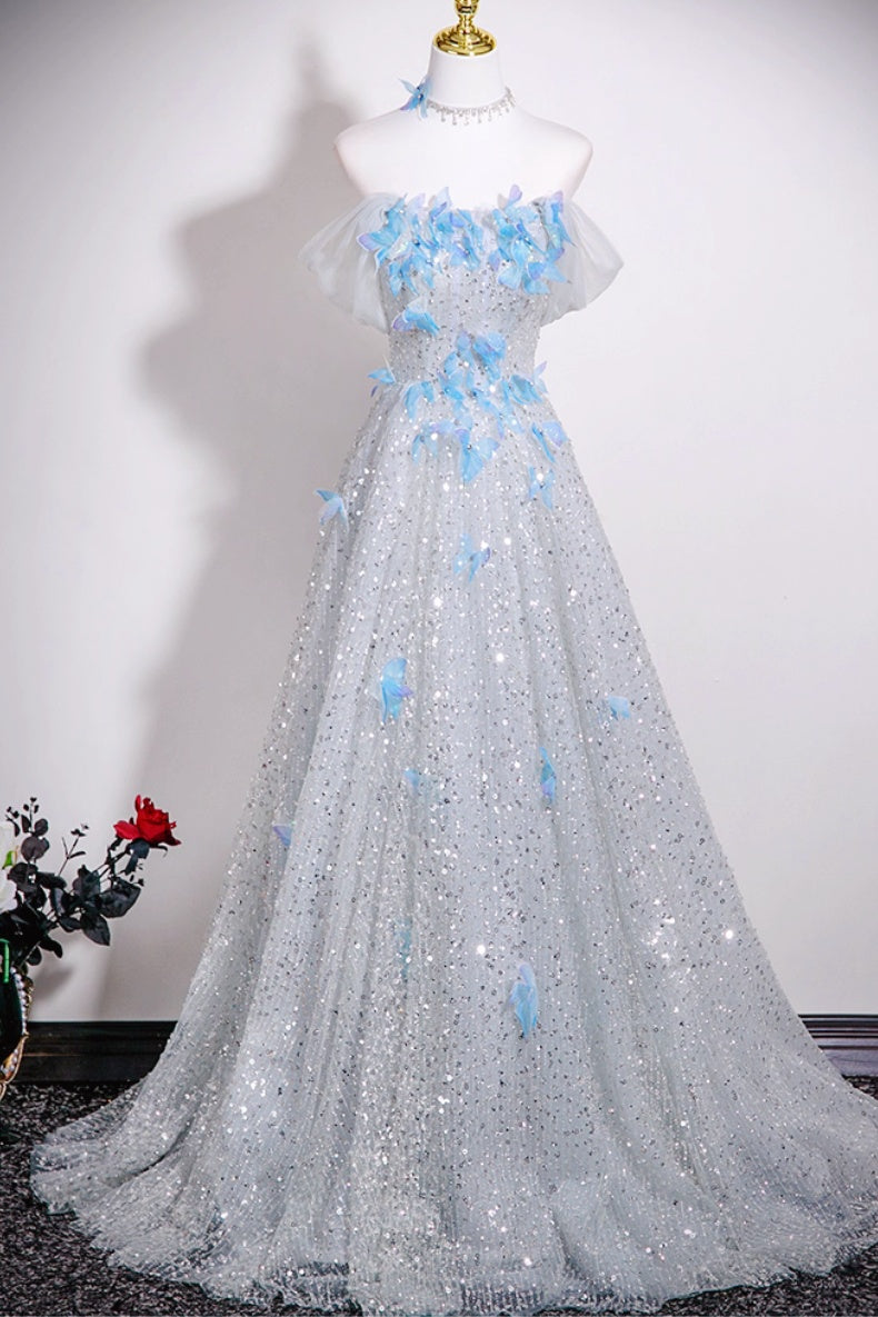 This elegant long dress features an A-line silhouette crafted from silver tulle. Designed off the shoulder, it showcases intricate rhinestone and sequin embroidery accented by a 3D butterfly applique. The gown exudes a luminous appeal with its shimmering details and is secured with a lace-up back for a tailored fit.
