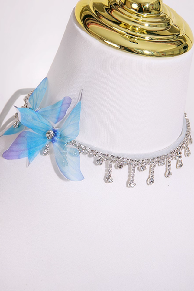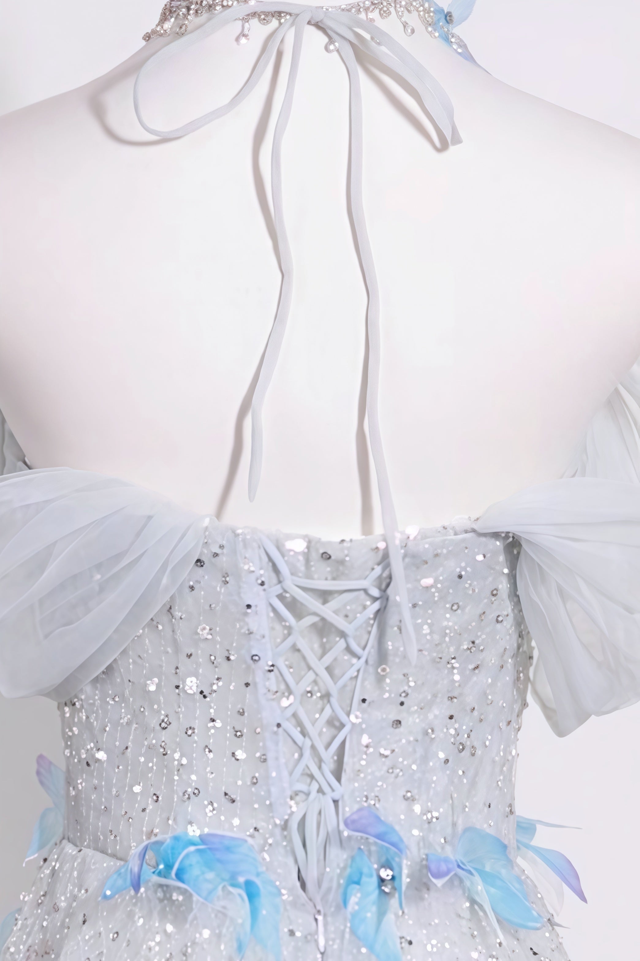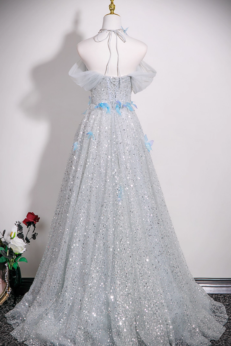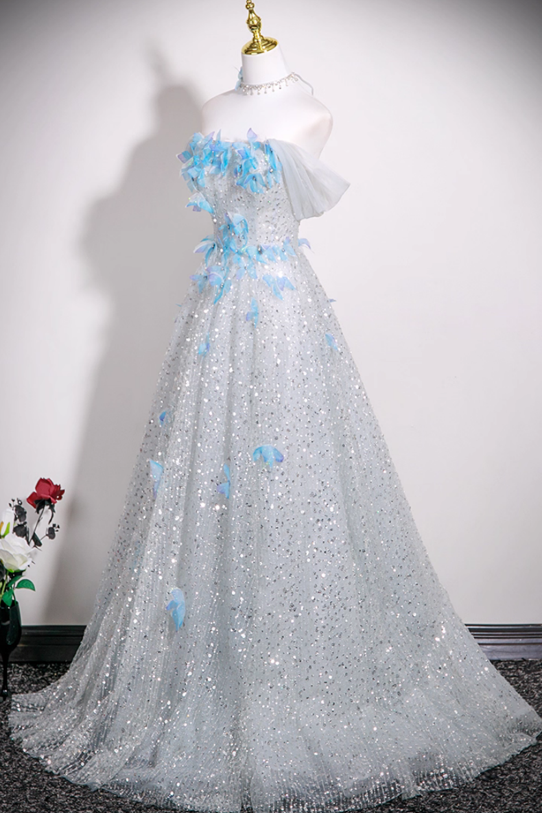 This elegant long dress features an A-line silhouette crafted from silver tulle. Designed off the shoulder, it showcases intricate rhinestone and sequin embroidery accented by a 3D butterfly applique. The gown exudes a luminous appeal with its shimmering details and is secured with a lace-up back for a tailored fit.