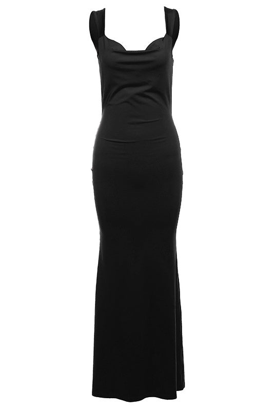 This elegant black mini dress combines stretch spandex fabric with a flattering A-line silhouette and supportive wide straps. The refined cowl neckline pairs beautifully with the open-back design, while a decorative bow accent at the waist adds a touch of sophistication. Ideal for cocktail events, dinner dates, or upscale occasions where polished style and comfortable movement are essential.