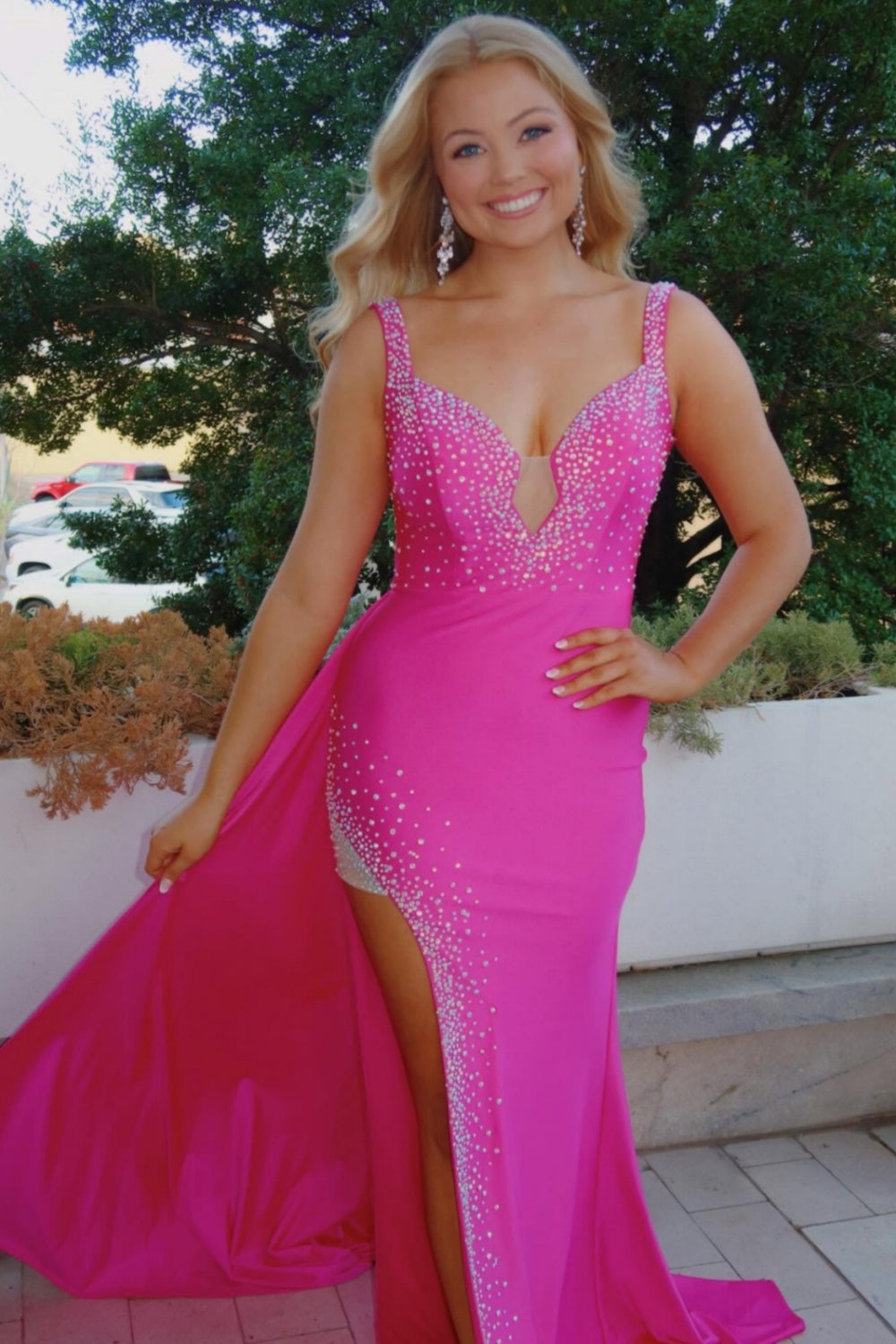 Hot Pink Straps V-neck Long Dress