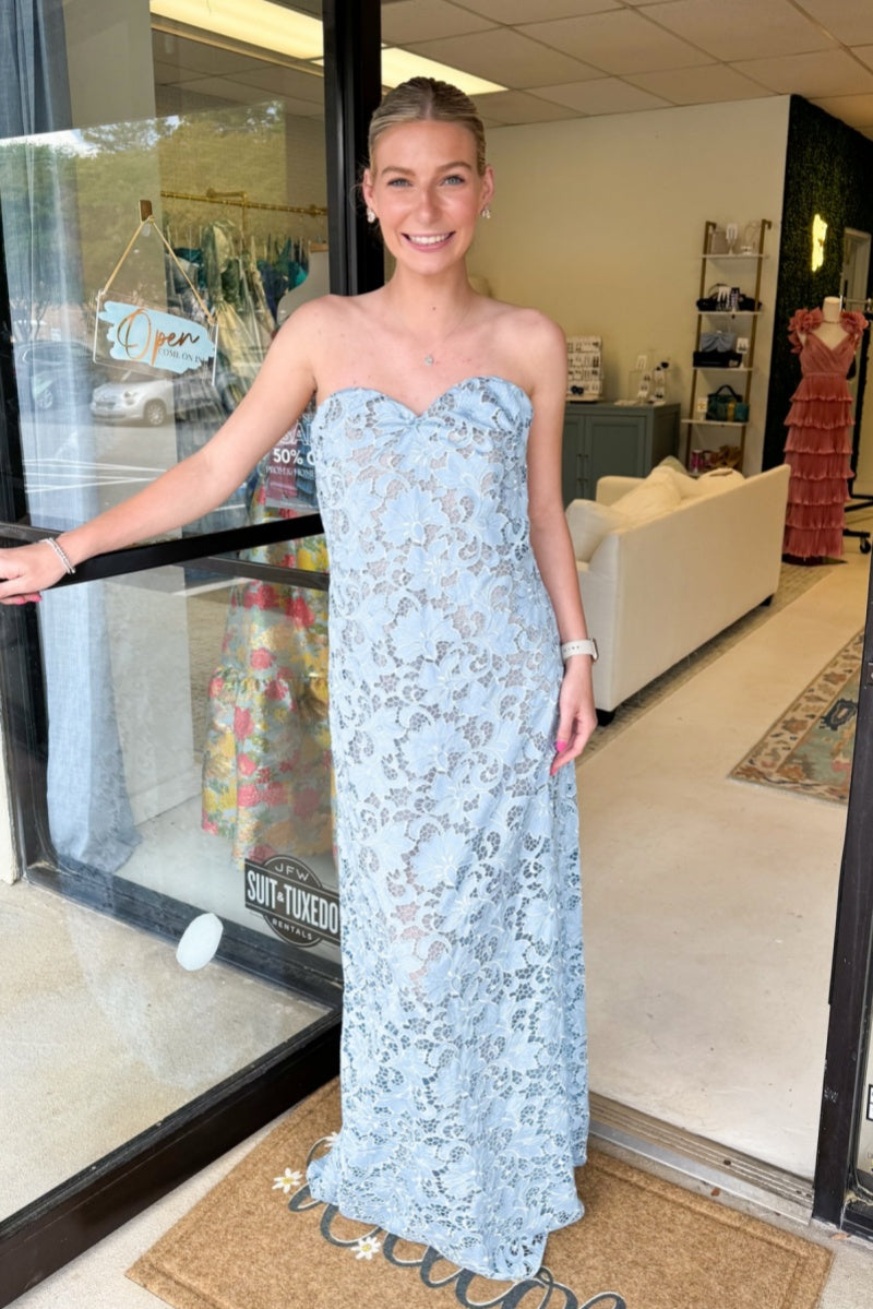 Light sky blue floral lace dress with a sweetheart neckline and full-length silhouette. Features delicate lace appliqué detailing and a back zipper closure for an elegant, timeless look.