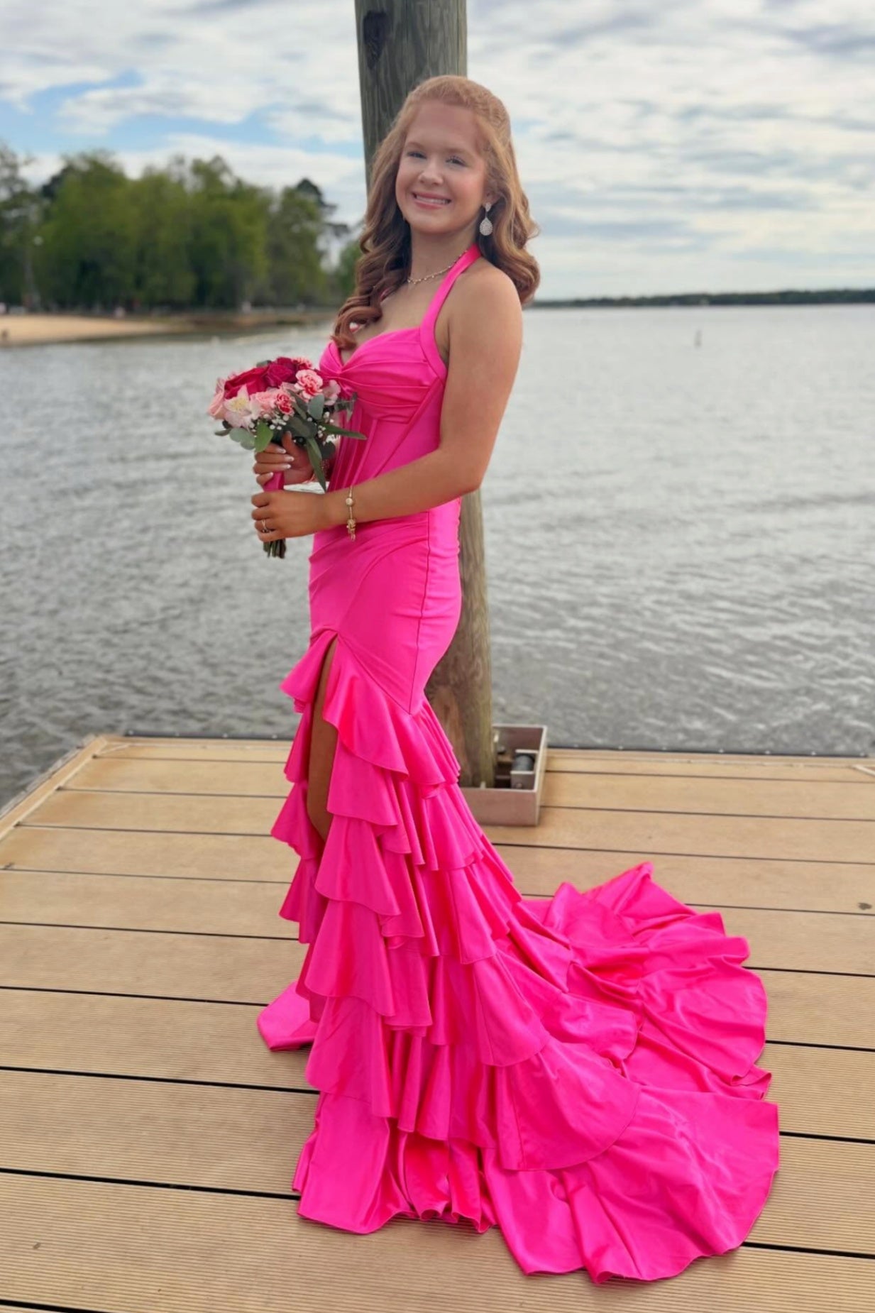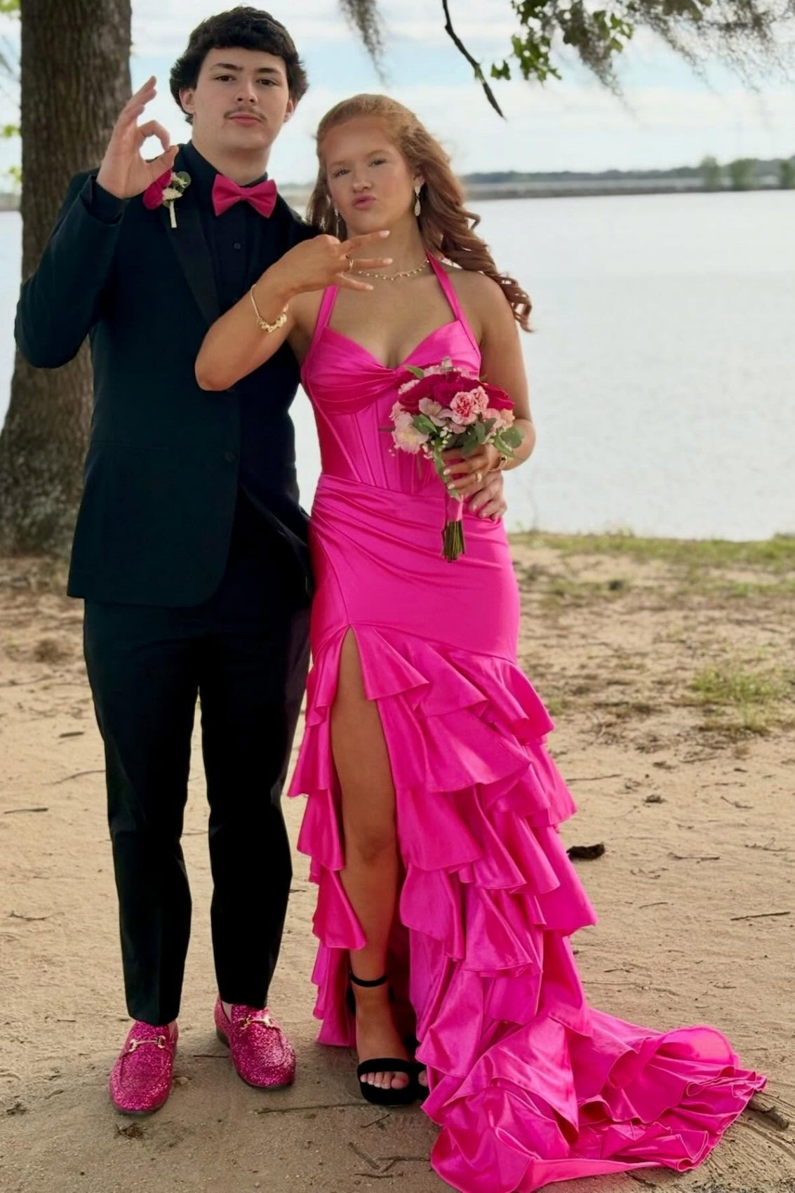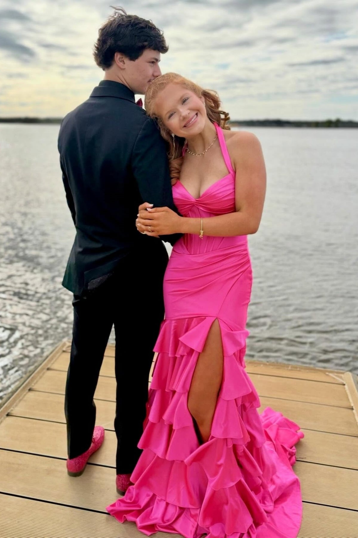 Elegant fitted dress in navy satin featuring a halter neck, boning corset, tiered ruffle skirt, and full-length sweep train. Includes a side slit and back zipper for easy wear and movement.