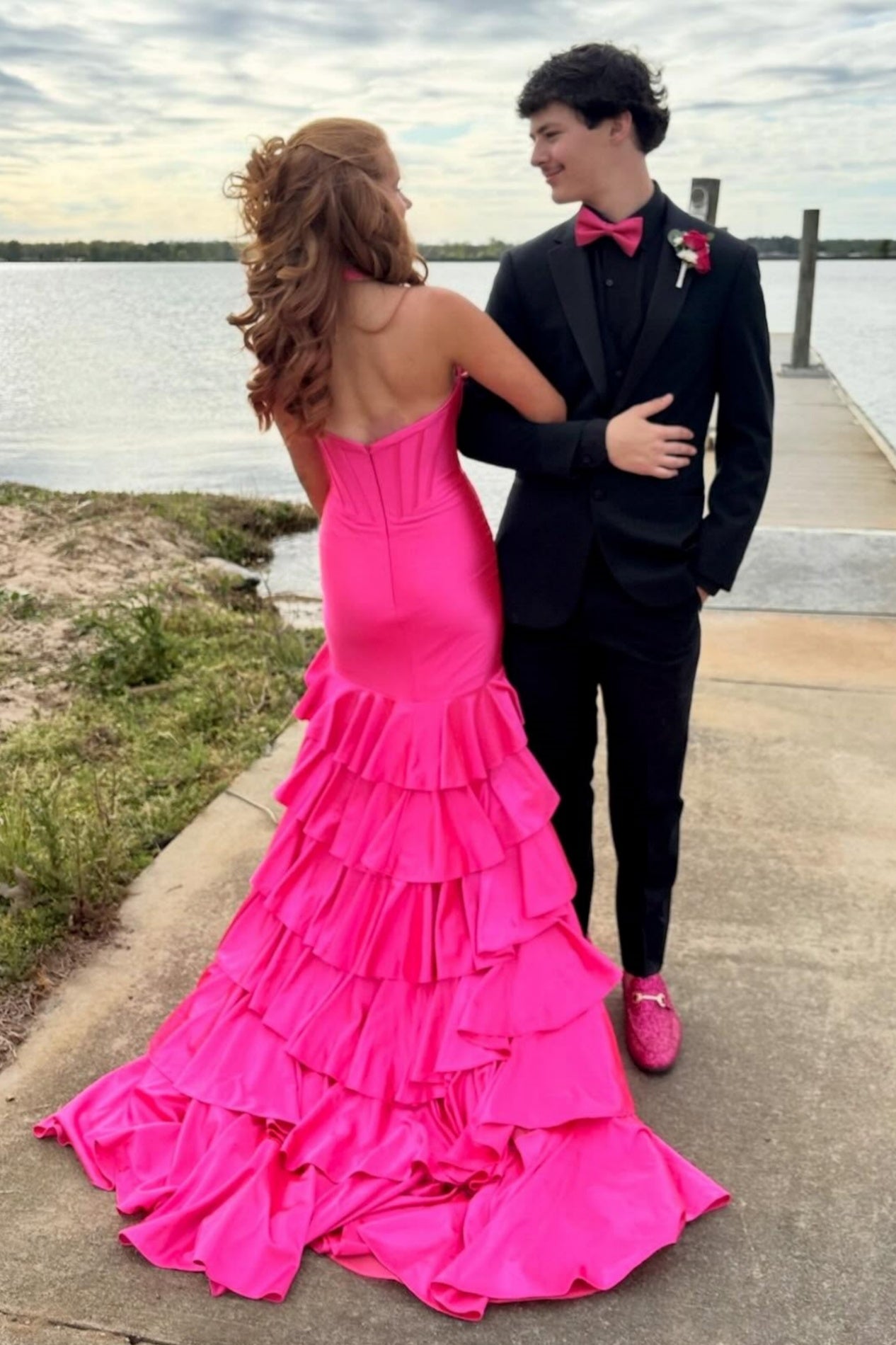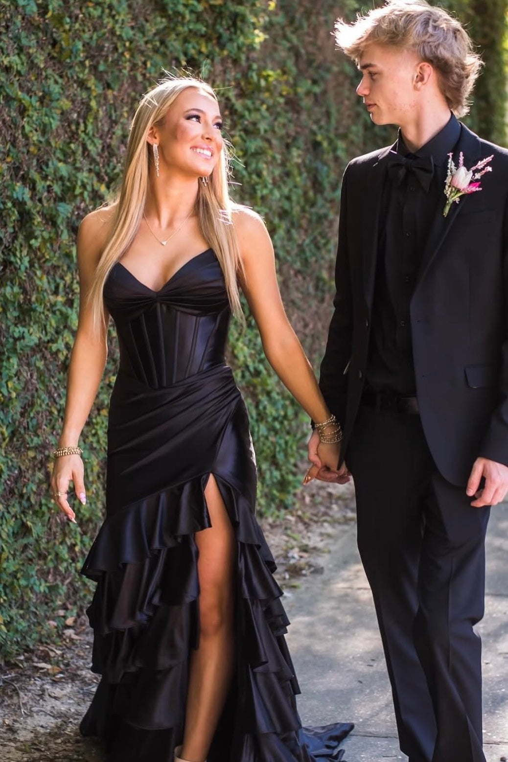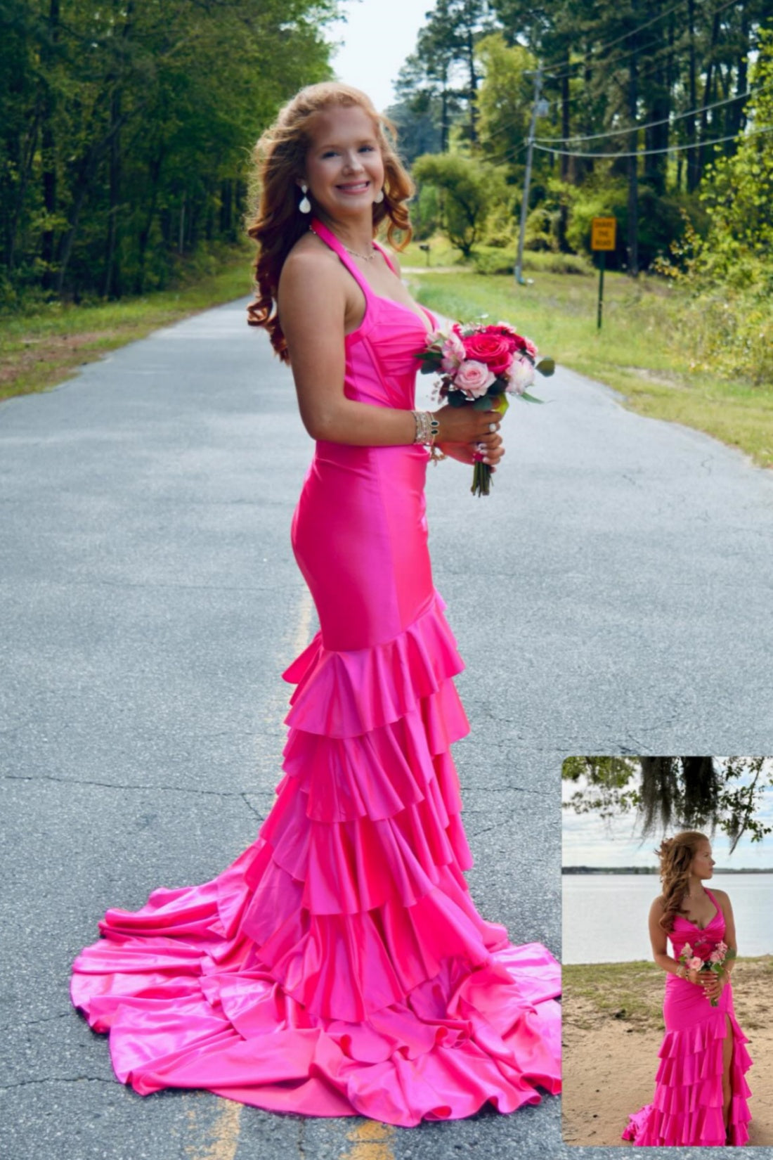 Elegant fitted dress in navy satin featuring a halter neck, boning corset, tiered ruffle skirt, and full-length sweep train. Includes a side slit and back zipper for easy wear and movement.