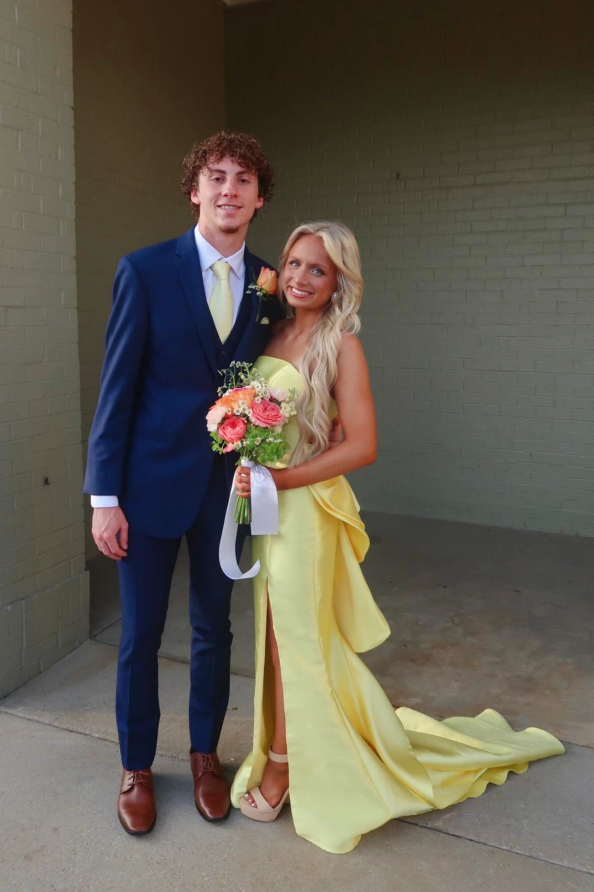 • Details: Side slit, tiered ruffle sweep train