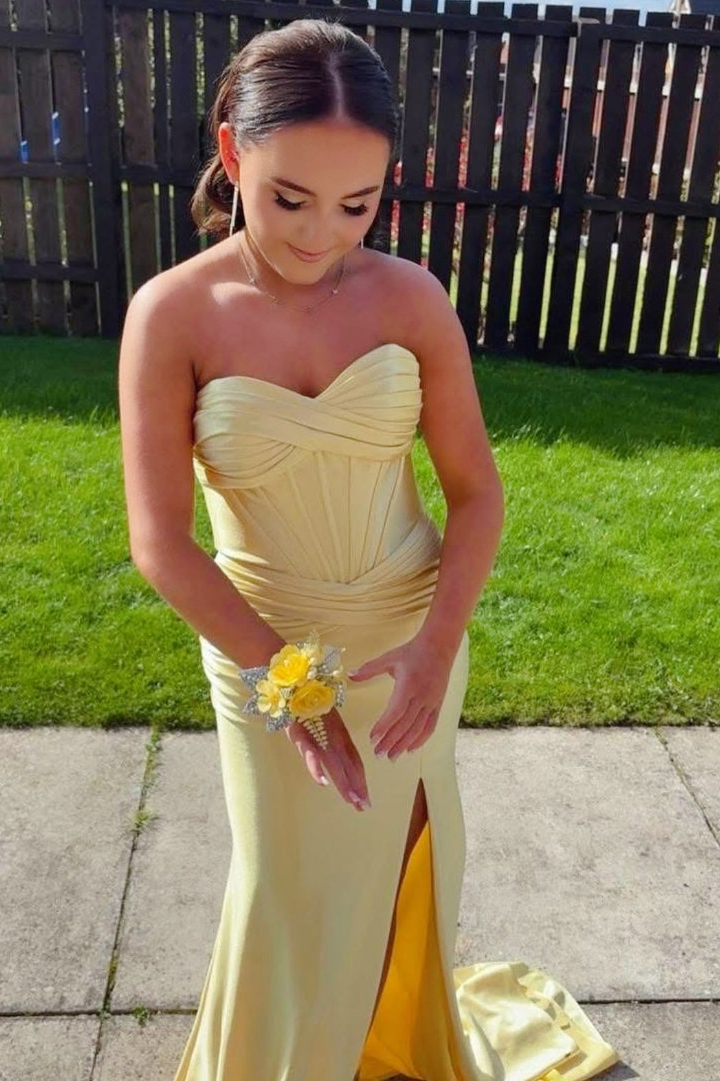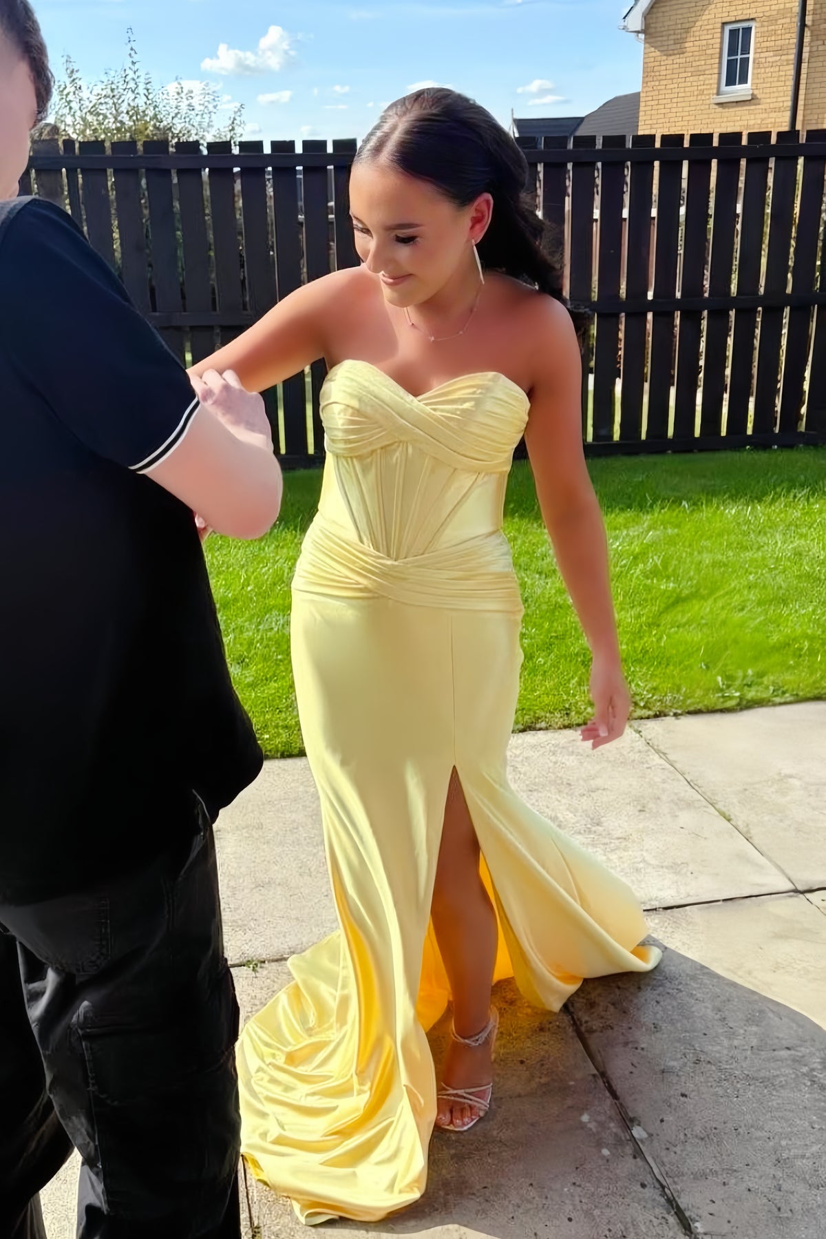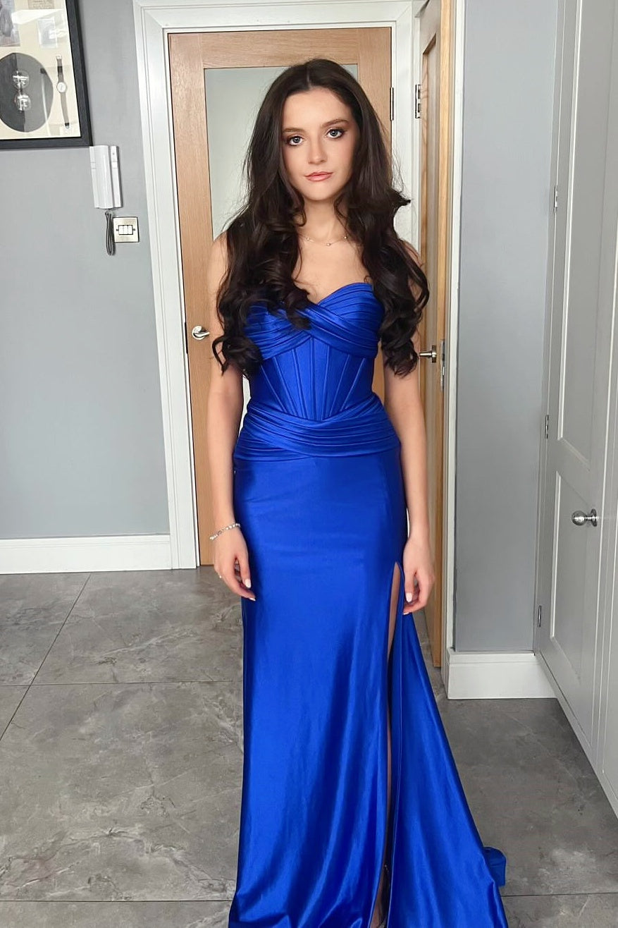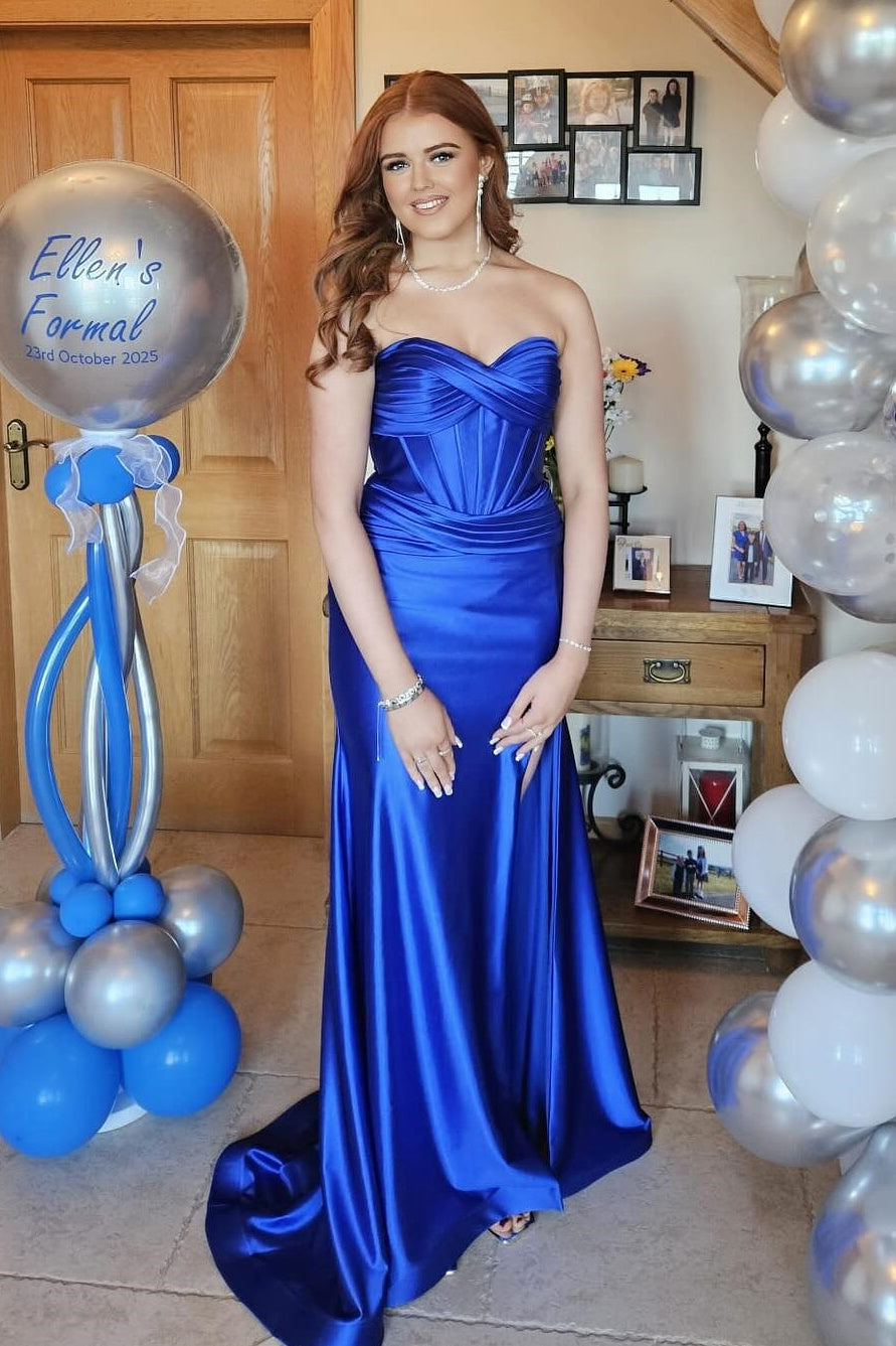 Crafted from luxurious satin, this striking mermaid gown features a sweetheart neckline and a structured corset bodice that flatters the figure. The elegant silhouette flows into a graceful full-length skirt with a subtle side slit and short train for refined movement. Finished with a secure zip-up back closure, this formal dress combines timeless sophistication with contemporary design details, making it an exceptional choice for upscale evening events.