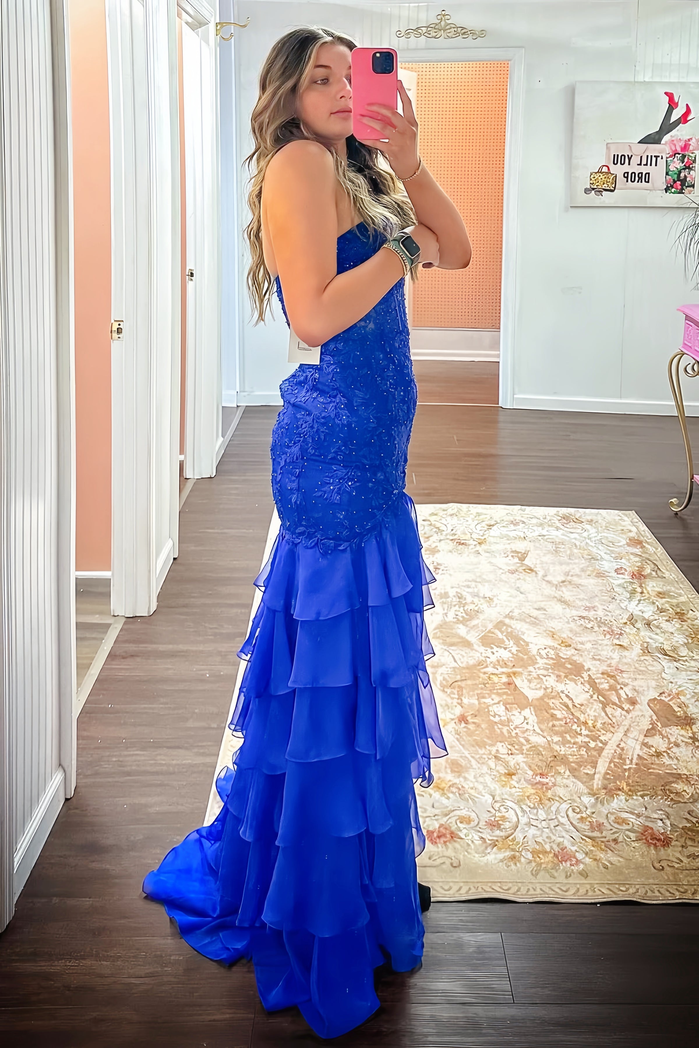 Strapless Teal Lace Appliques Fitted Ruffle Prom Dress