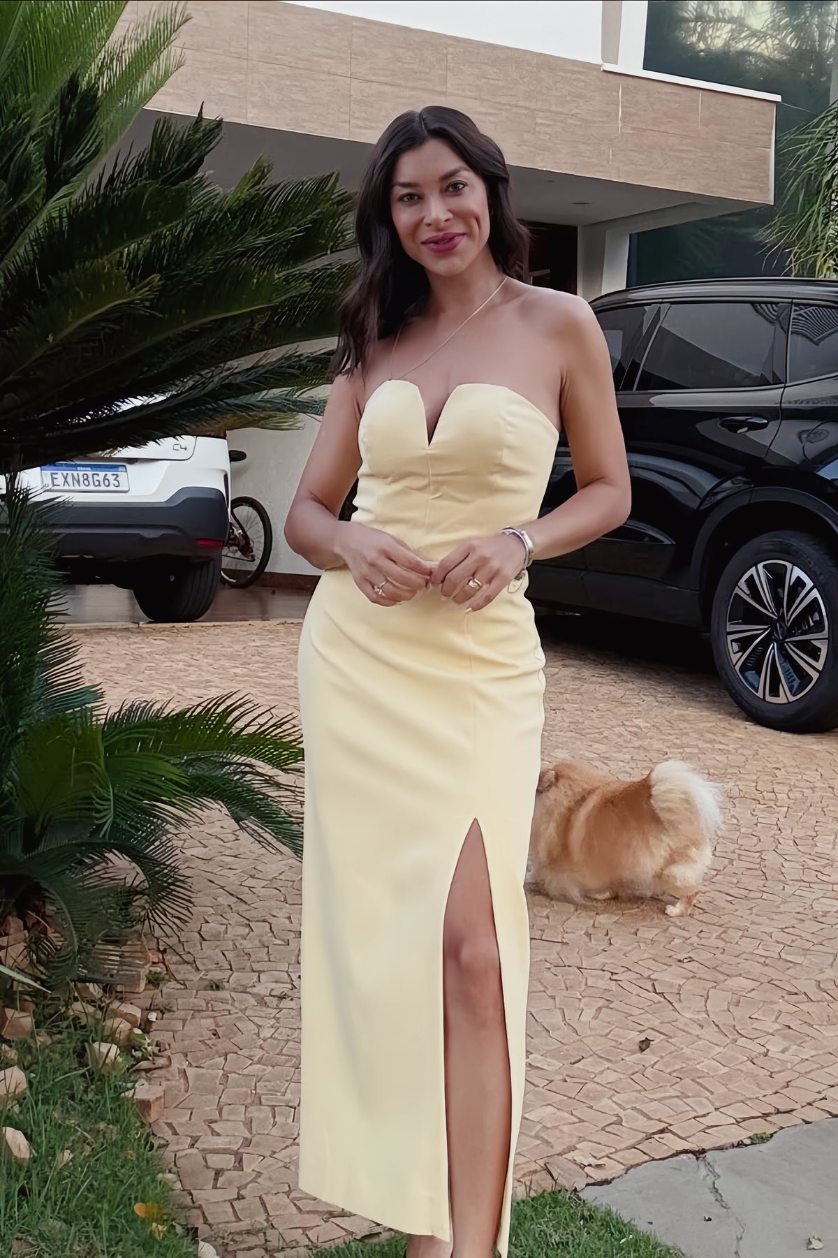 Crafted from premium polyester, this striking floor-length dress features a flattering bodycon silhouette with a plunging V-neckline and delicate spaghetti straps. The dramatic side slit adds movement and sophistication, while the low back design creates an elegant statement. A concealed back zipper ensures a seamless fit. Available in a luminous light yellow that radiates understated glamour for any formal occasion.