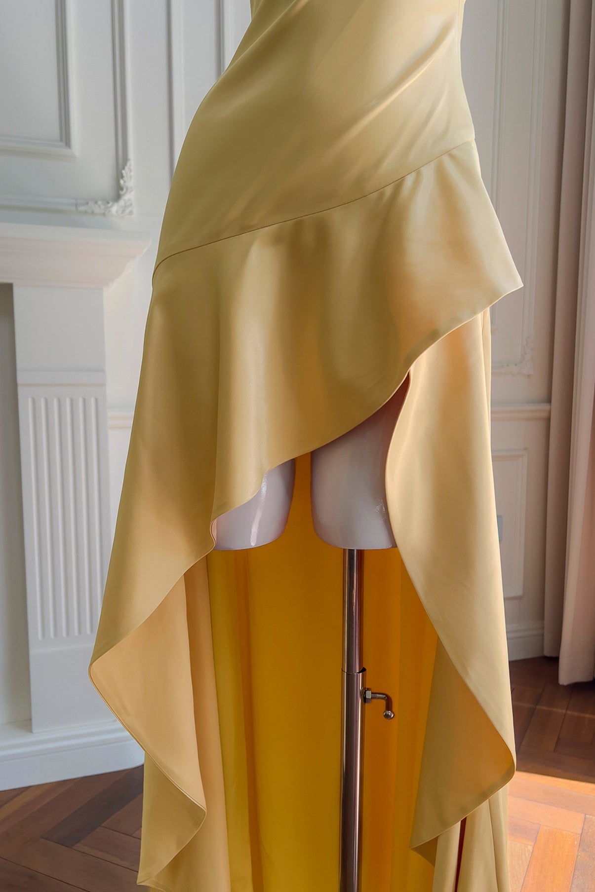 - Asymmetrical ruffled hem