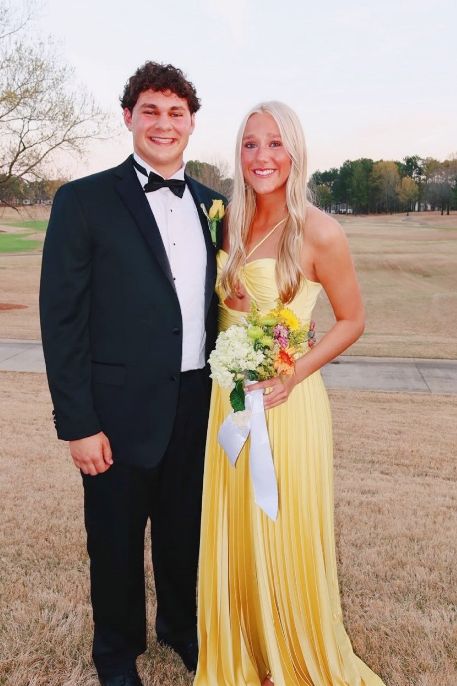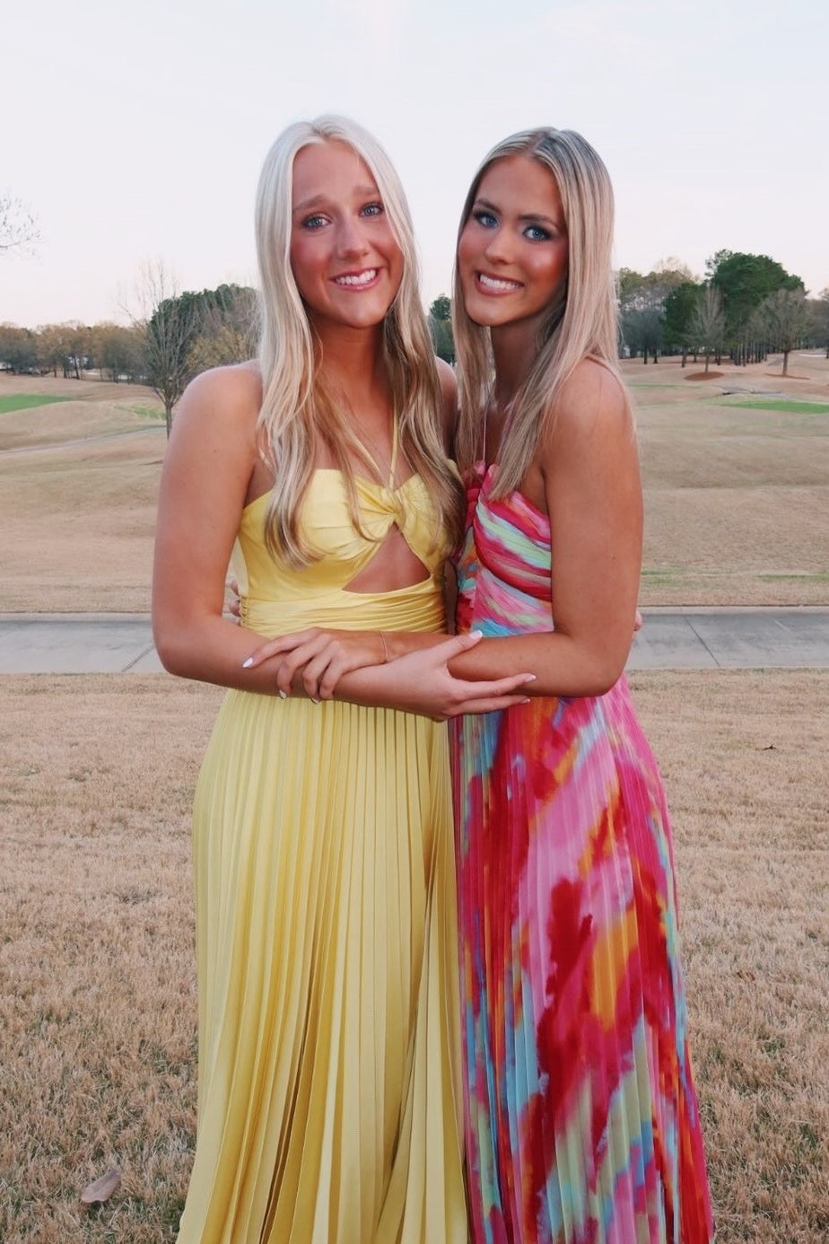 Yellow satin A-line gown with halter neckline and spaghetti straps, bust cut-out, pleated details, full-length skirt, and back zipper closure.