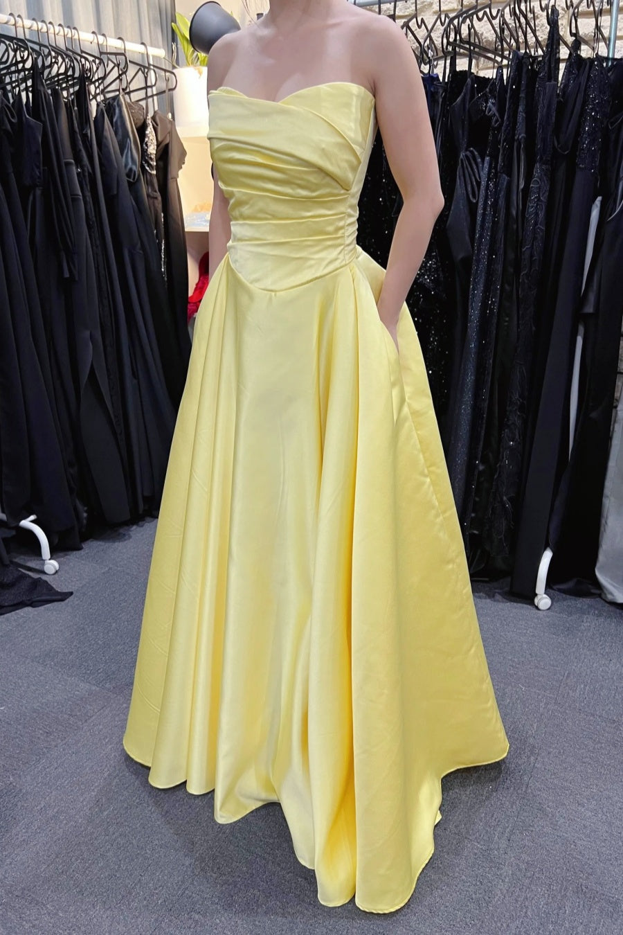 Yellow Strapless Satin A-line Long Formal Gown