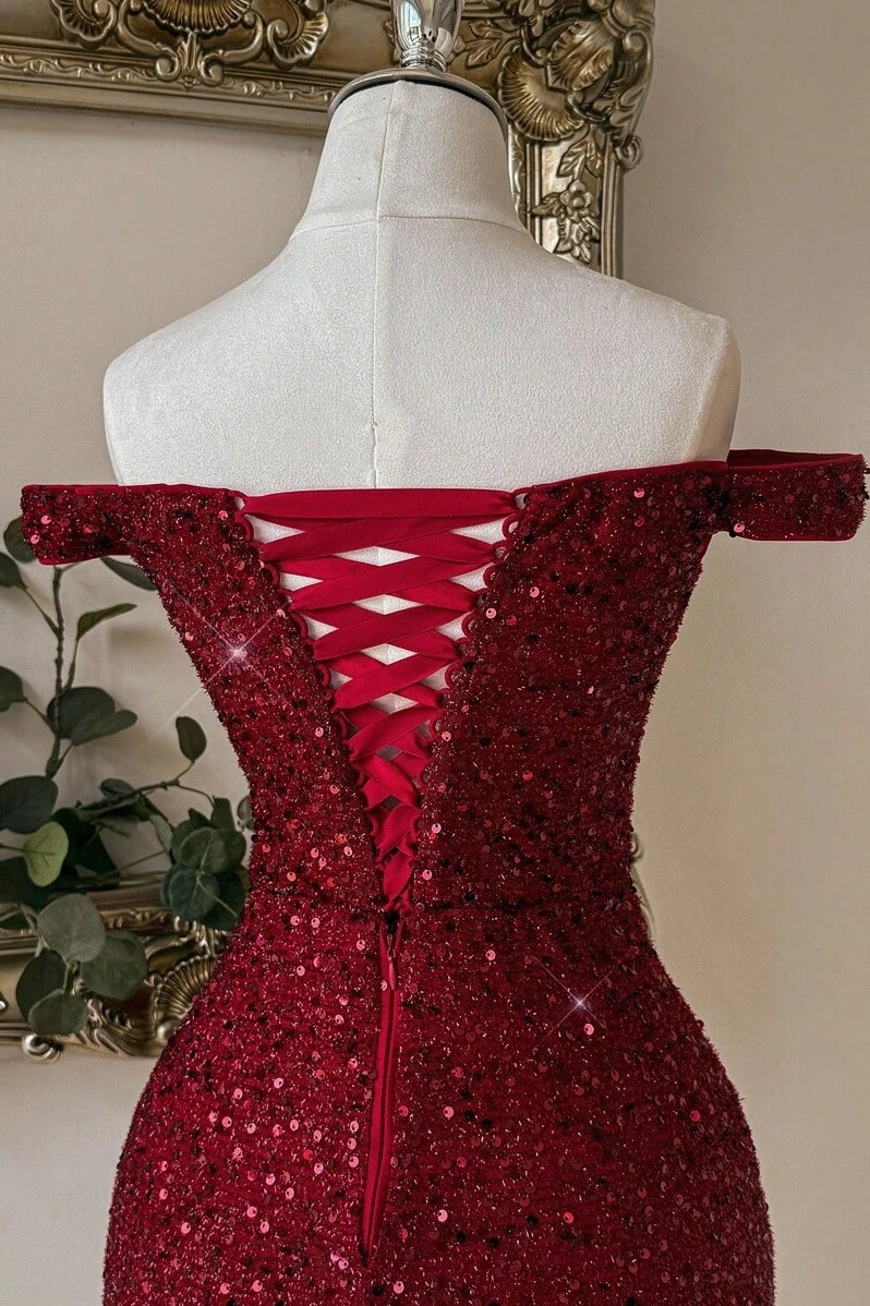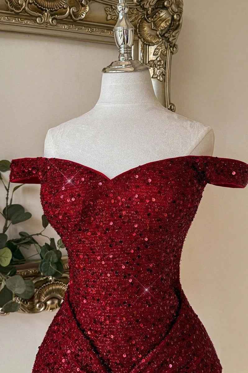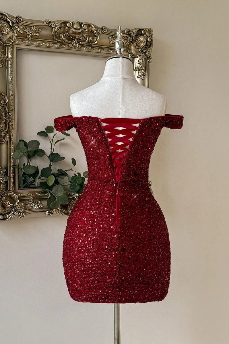 Burgundy Sequin Off-the-shoulder Mini Dress