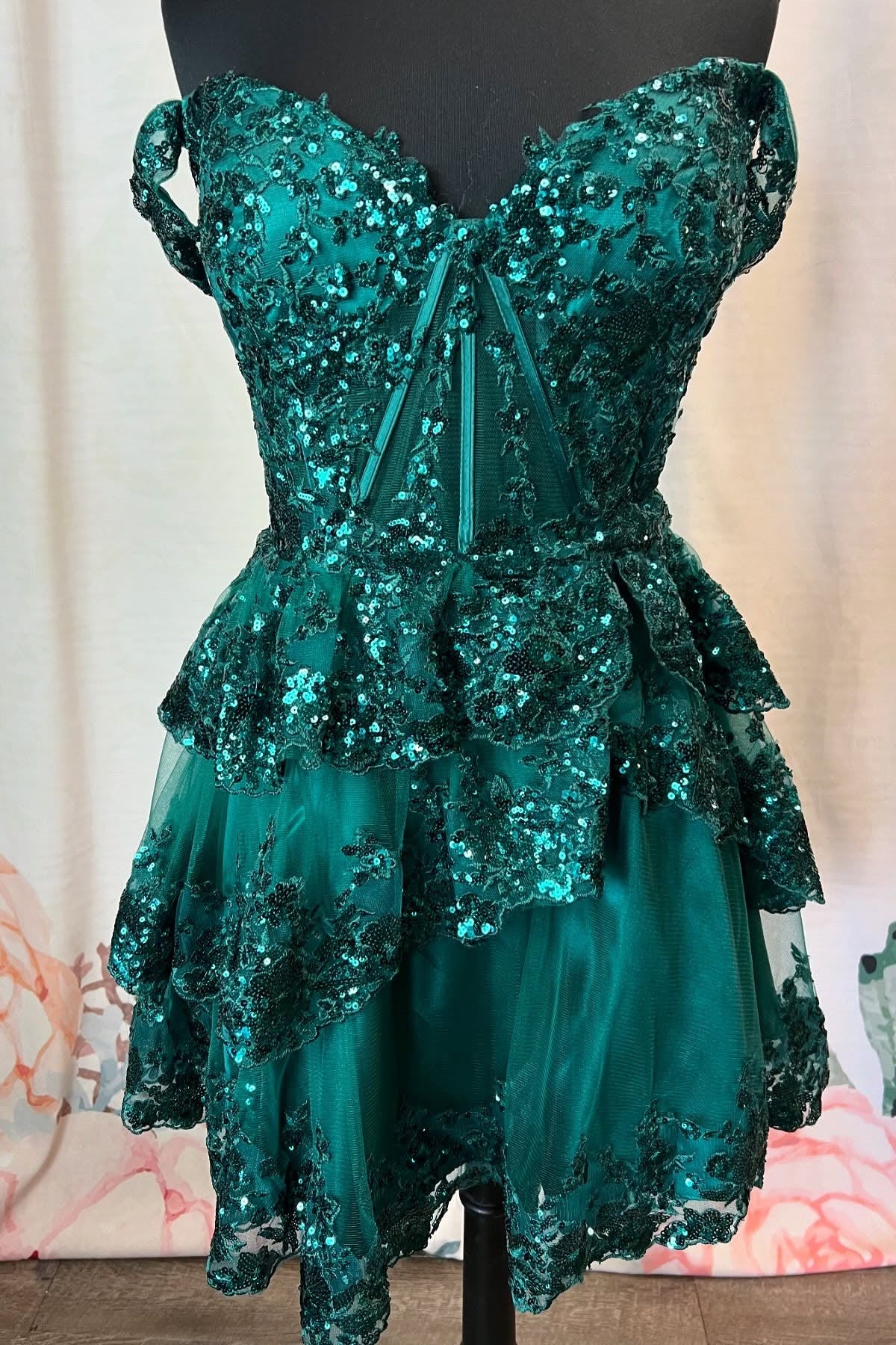 This mini dress features sequin embroidery in a peacock green shade with an A-line silhouette and a sweetheart neckline. Crafted from polyester fiber, it has a non-stretch fabric, strapless design, and tiered ruffle skirt, creating a ball gown style with an empire waist.