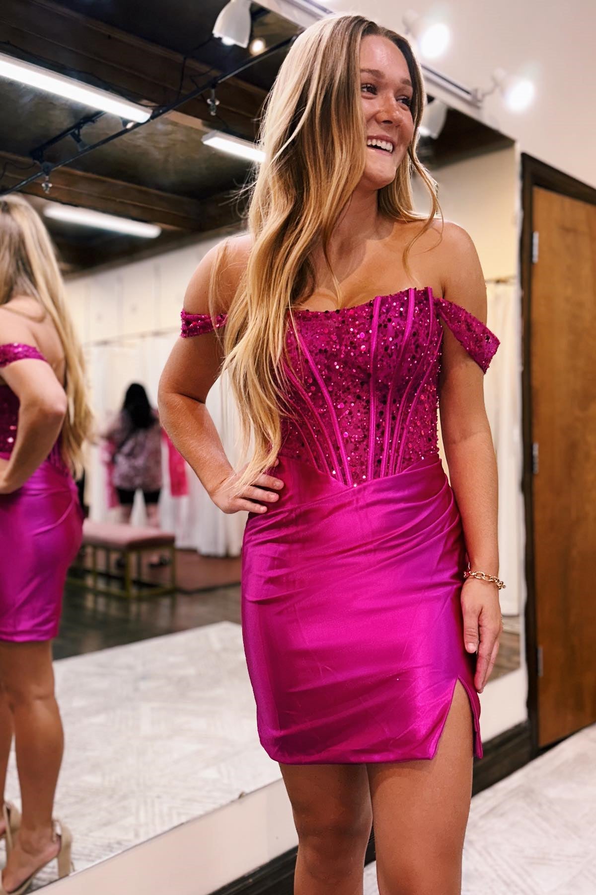 The gorgeous dark green satin tight mini dress features an off-the-shoulder neck, a beaded bodice, and a zip-up back.